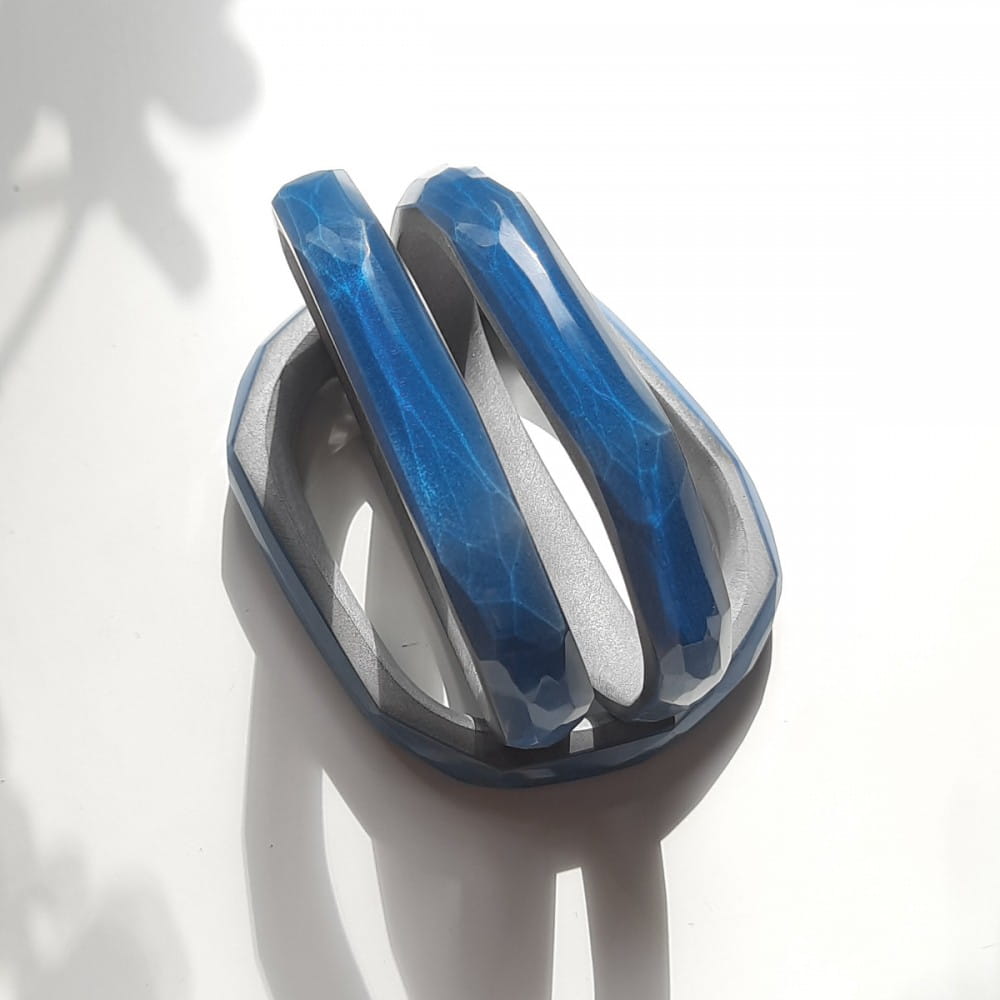 AQUA bracelet creates a hypnotizing floating water surface effect. Made from colored transparent resin grinded into small facets and polished to high gloss. Thanks to its metallic base (resin with powdered aluminum) the transparent part of the bracelet creates reflections in day sunlight.