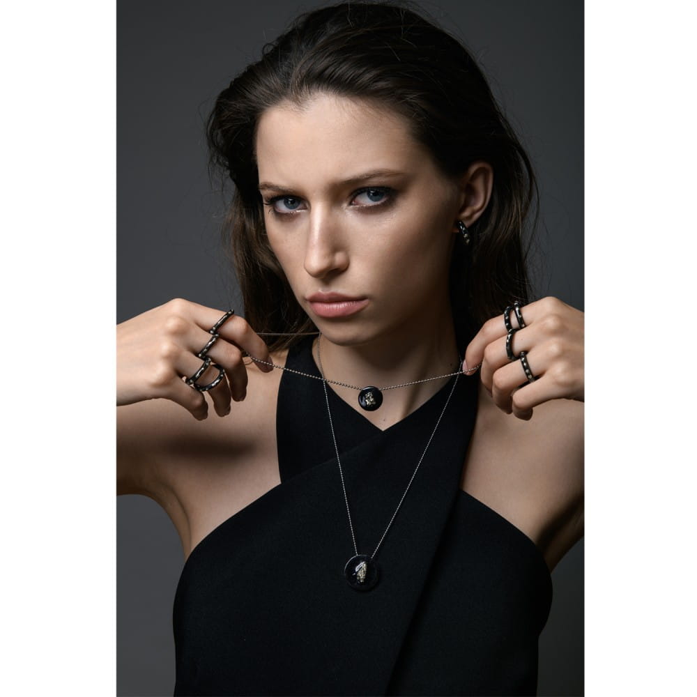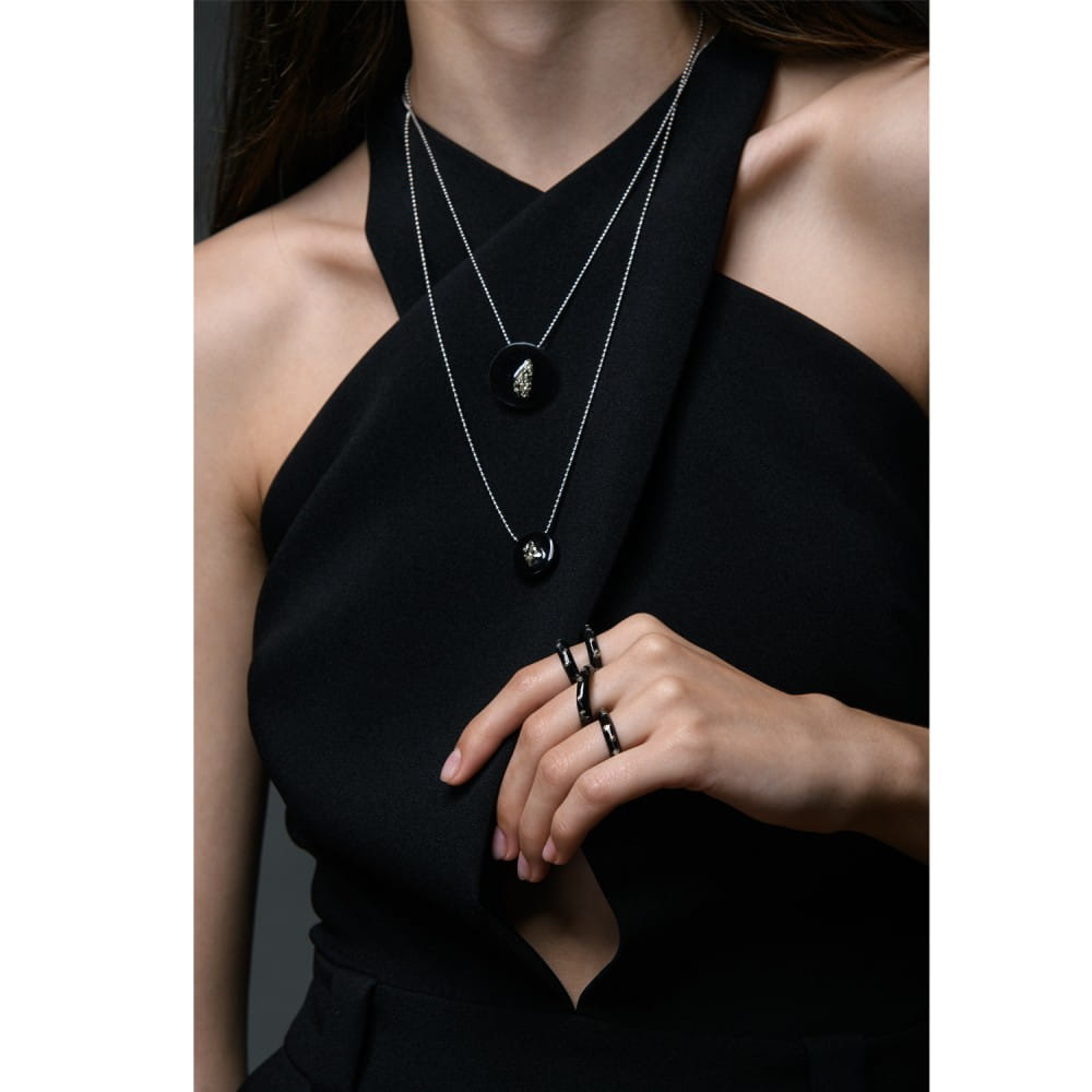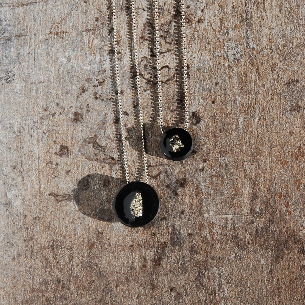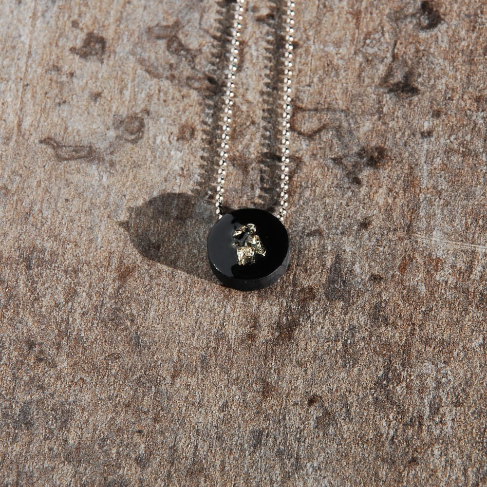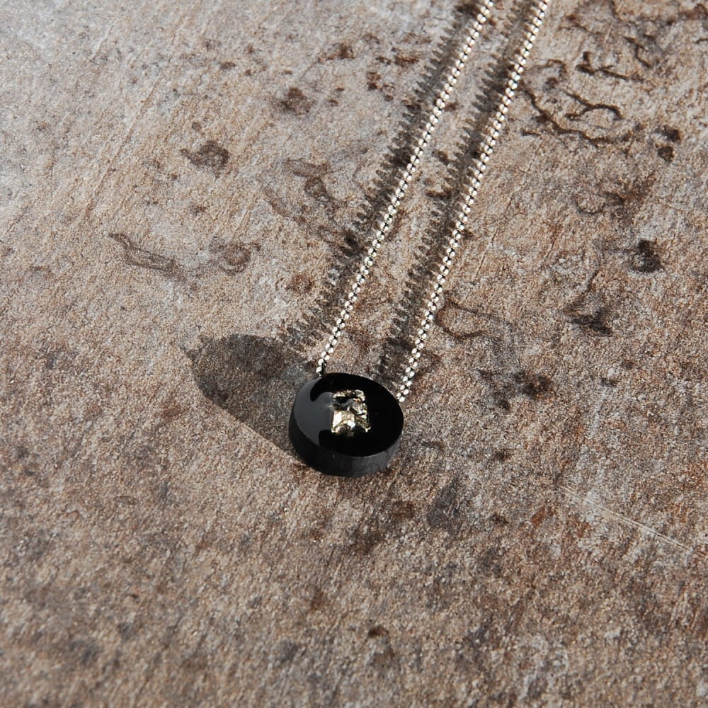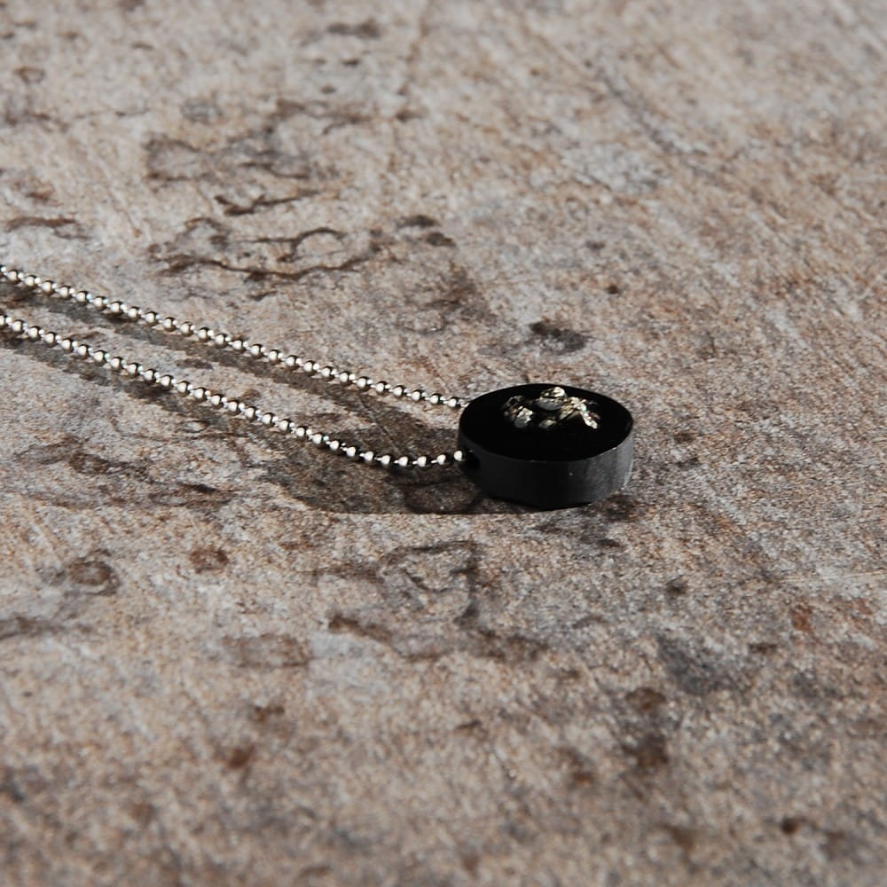 Unique necklace with natural pyrite framed in black resin. Overall chain length (surgical steel): 45cm (40+5cm elongated chain), 55cm (50+5cm elongated chain) 70cm, element dimensions 16mm.