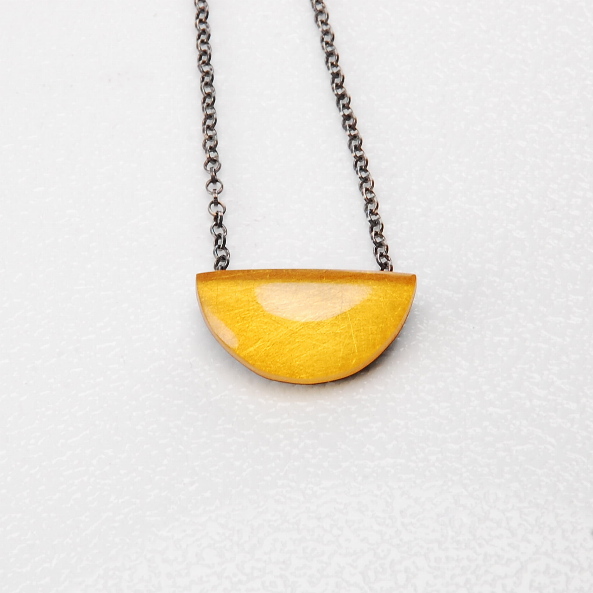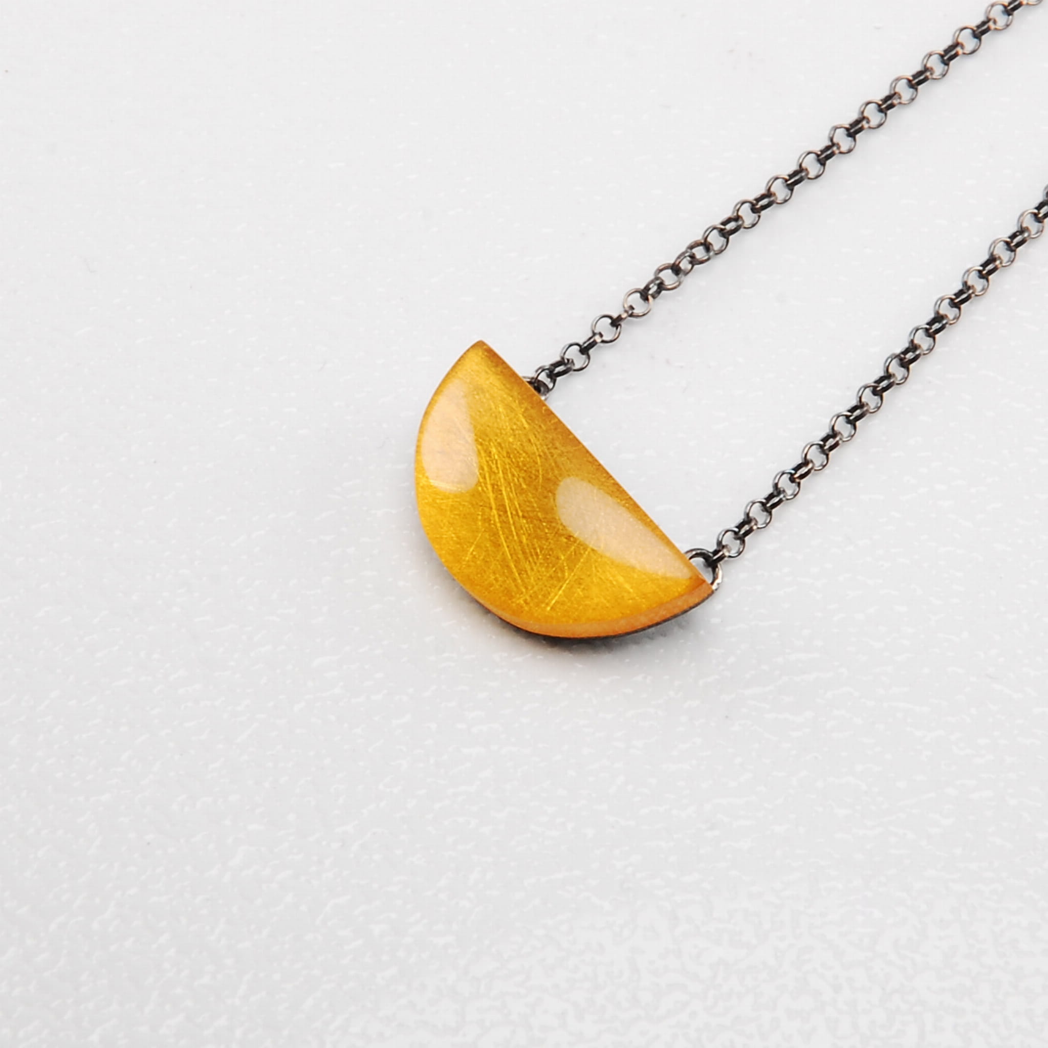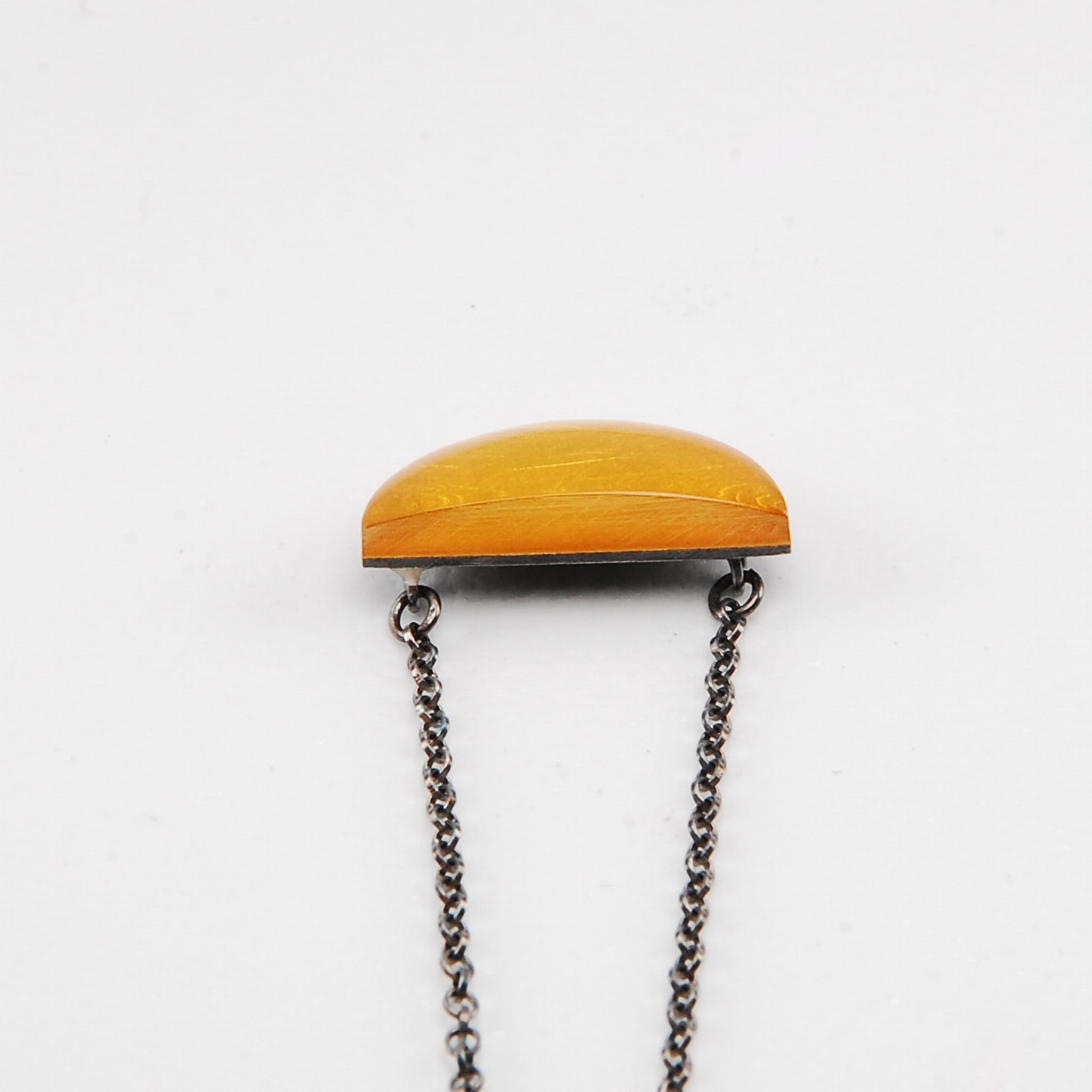 A minimalist amber necklace. Crafted from oxidized 925 sterling silver and Baltic amber in cherry, cognac, or lemon colors. The amber catches reflections that bounce off the silver base. The top surface of the amber is polished, while the edges are matte. The amber measures 8x16mm, is 3mm high, and the necklace is 55cm long.