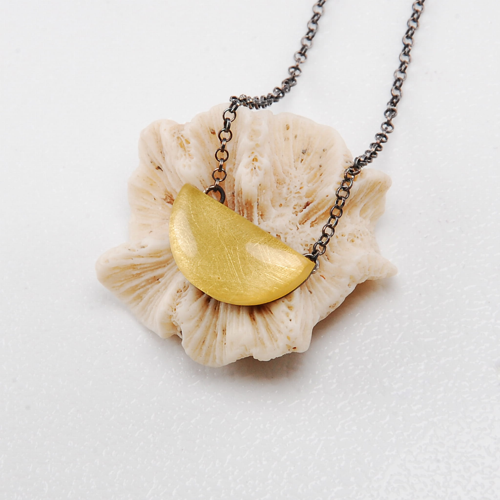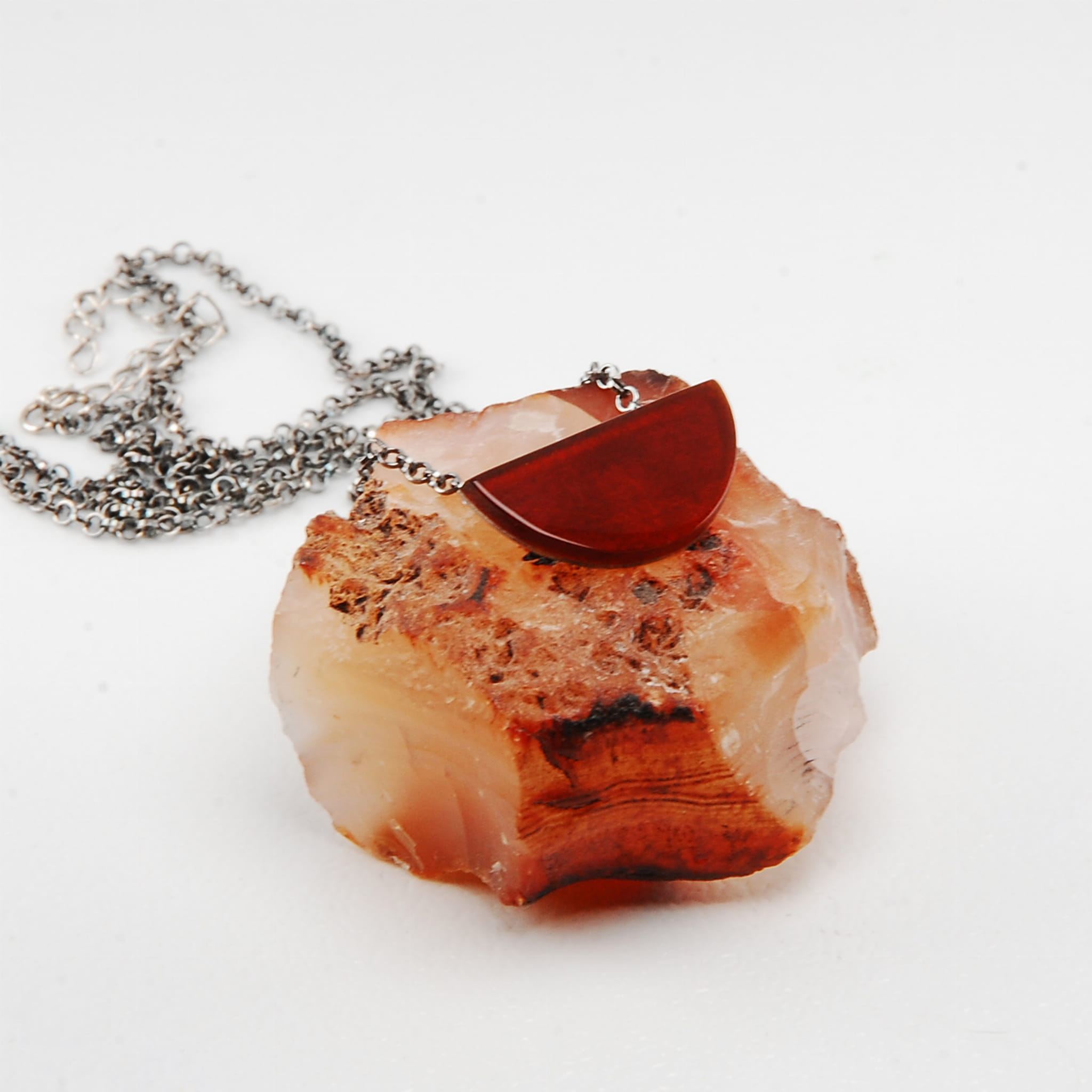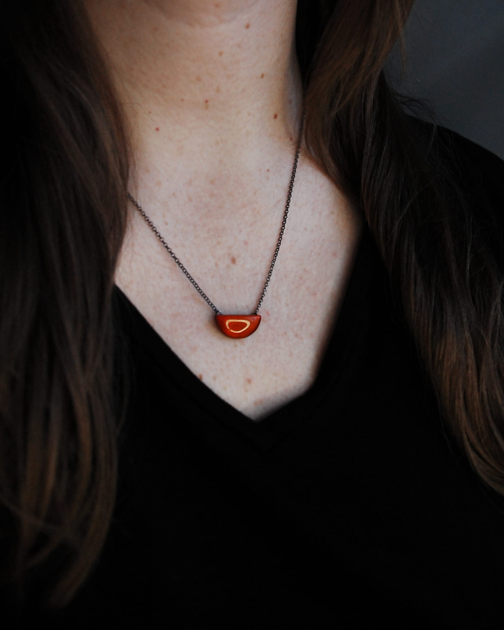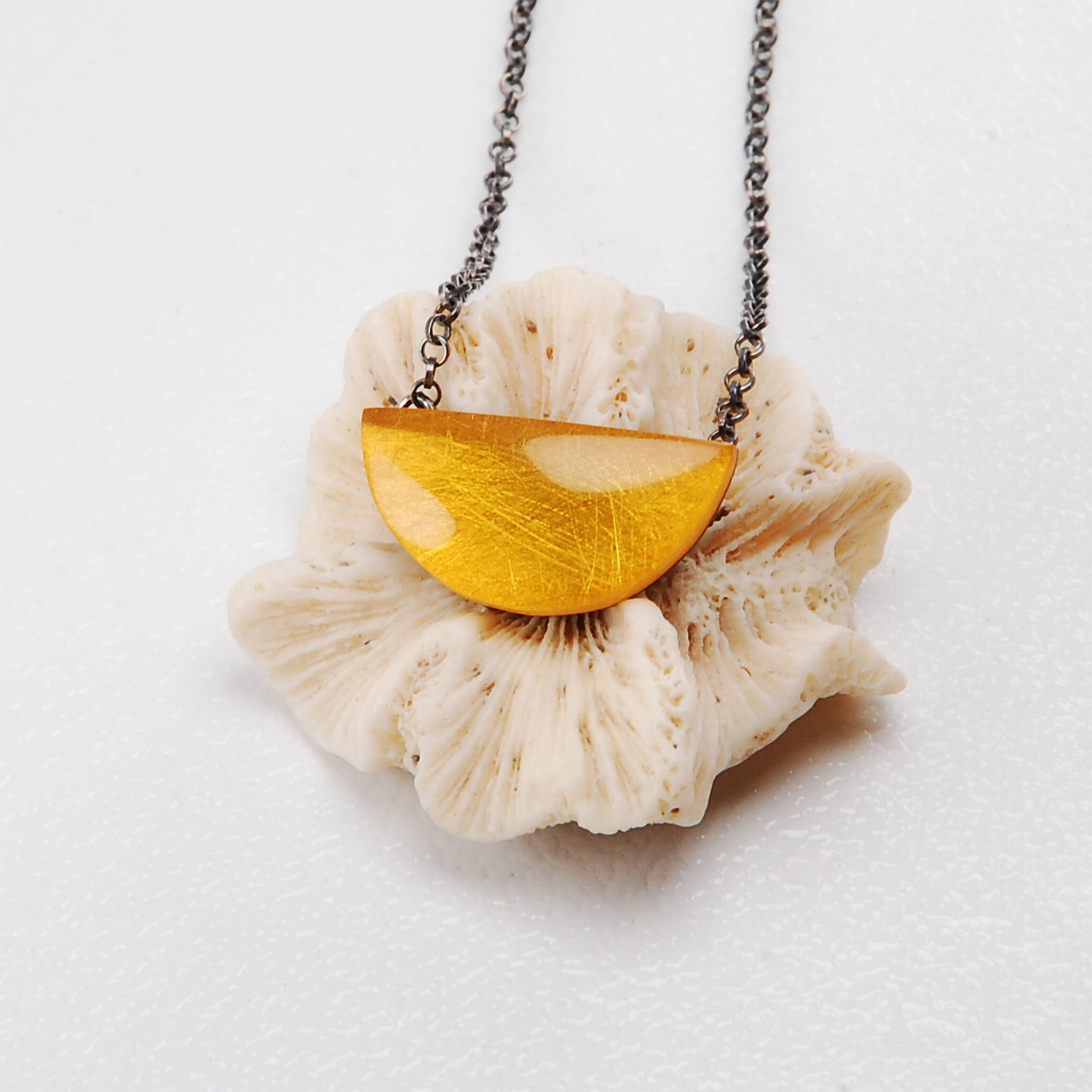 A minimalist amber necklace. Crafted from oxidized 925 sterling silver and Baltic amber in cherry, cognac, or lemon colors. The amber catches reflections that bounce off the silver base. The top surface of the amber is polished, while the edges are matte. The amber measures 8x16mm, is 3mm high, and the necklace is 55cm long.