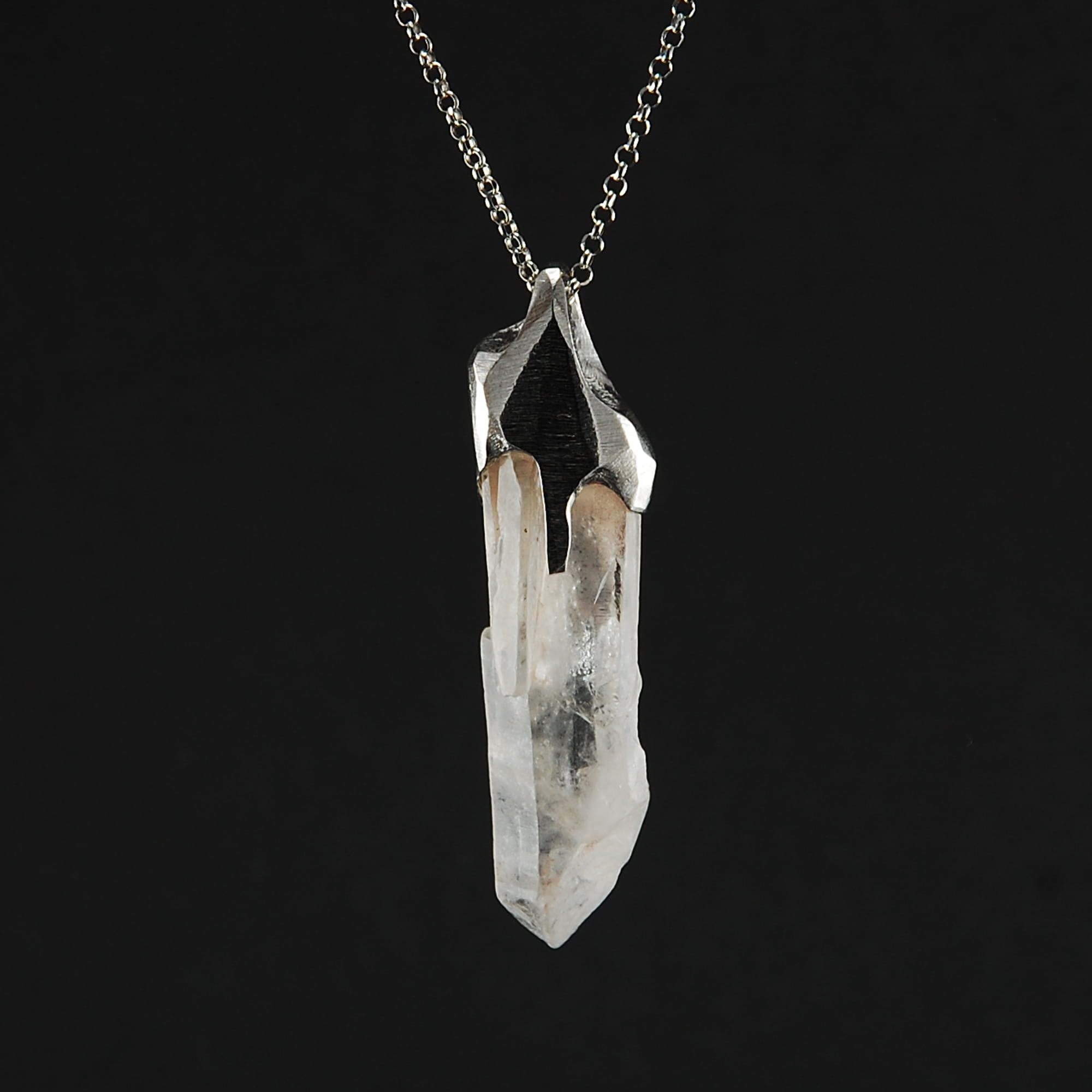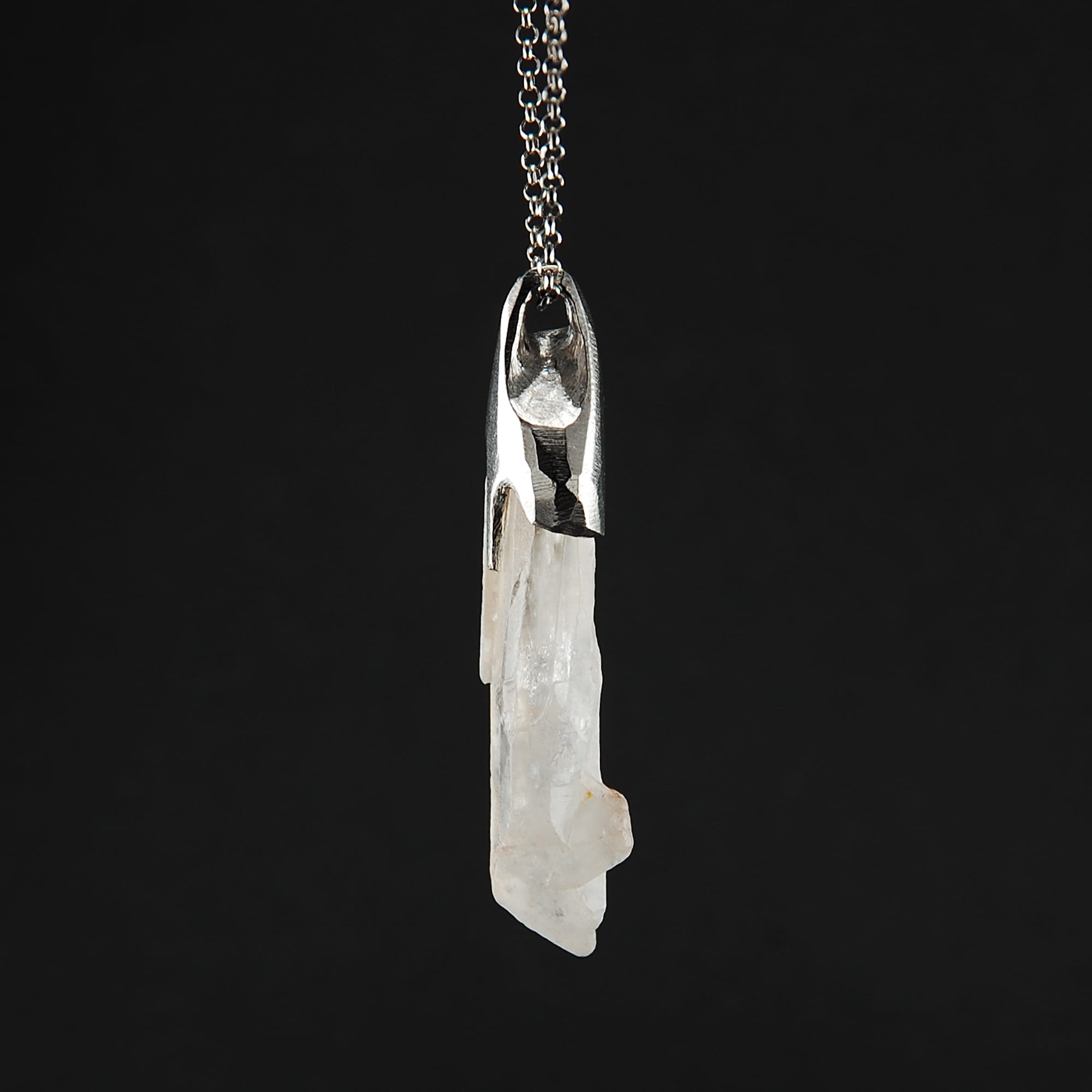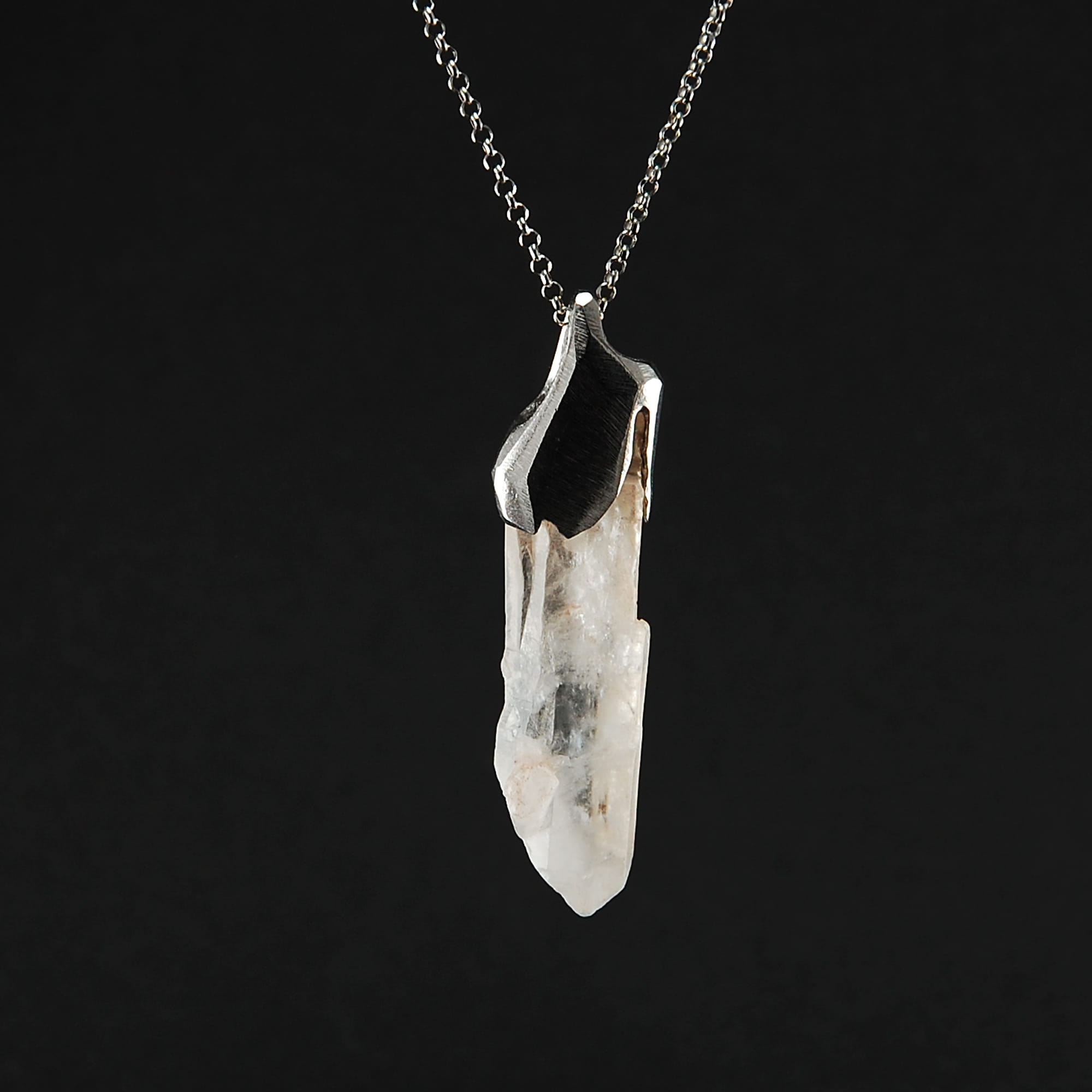 Unikatowy naszyjnik z naturalnym kryształem górskim oprawionym w srebro próby 925 pokrytego szlachetnym rodem, dzięki czemu srebro nie ciemnieje.