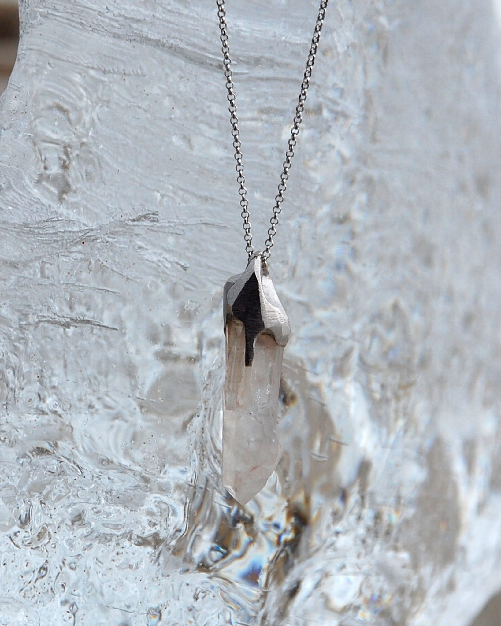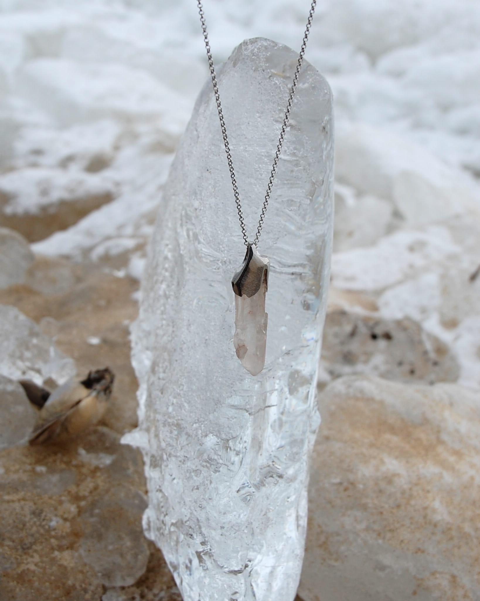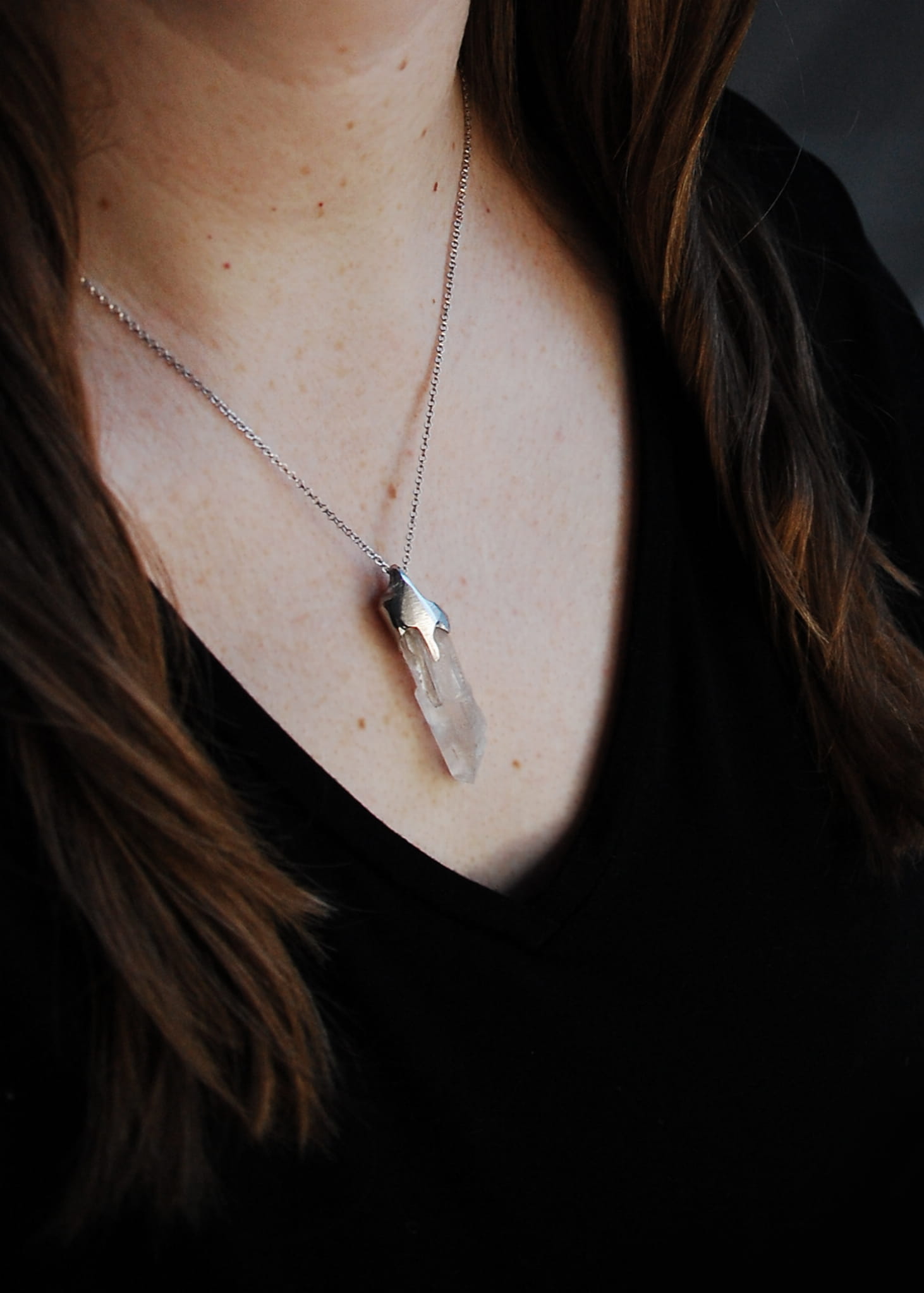 Unikatowy naszyjnik z naturalnym kryształem górskim oprawionym w srebro próby 925 pokrytego szlachetnym rodem, dzięki czemu srebro nie ciemnieje.