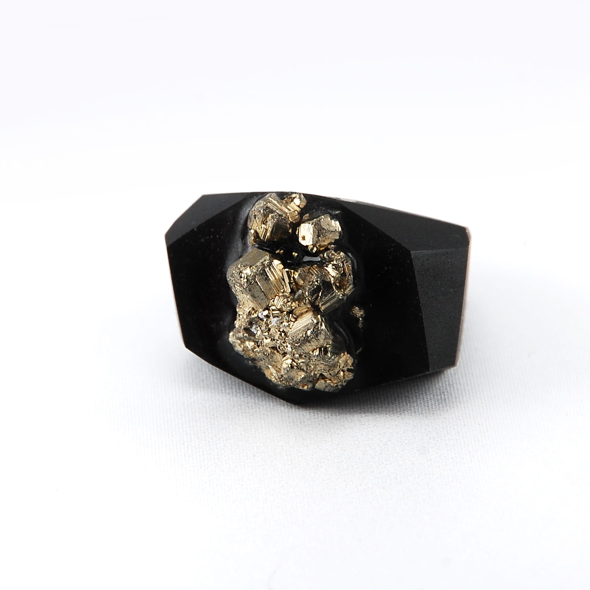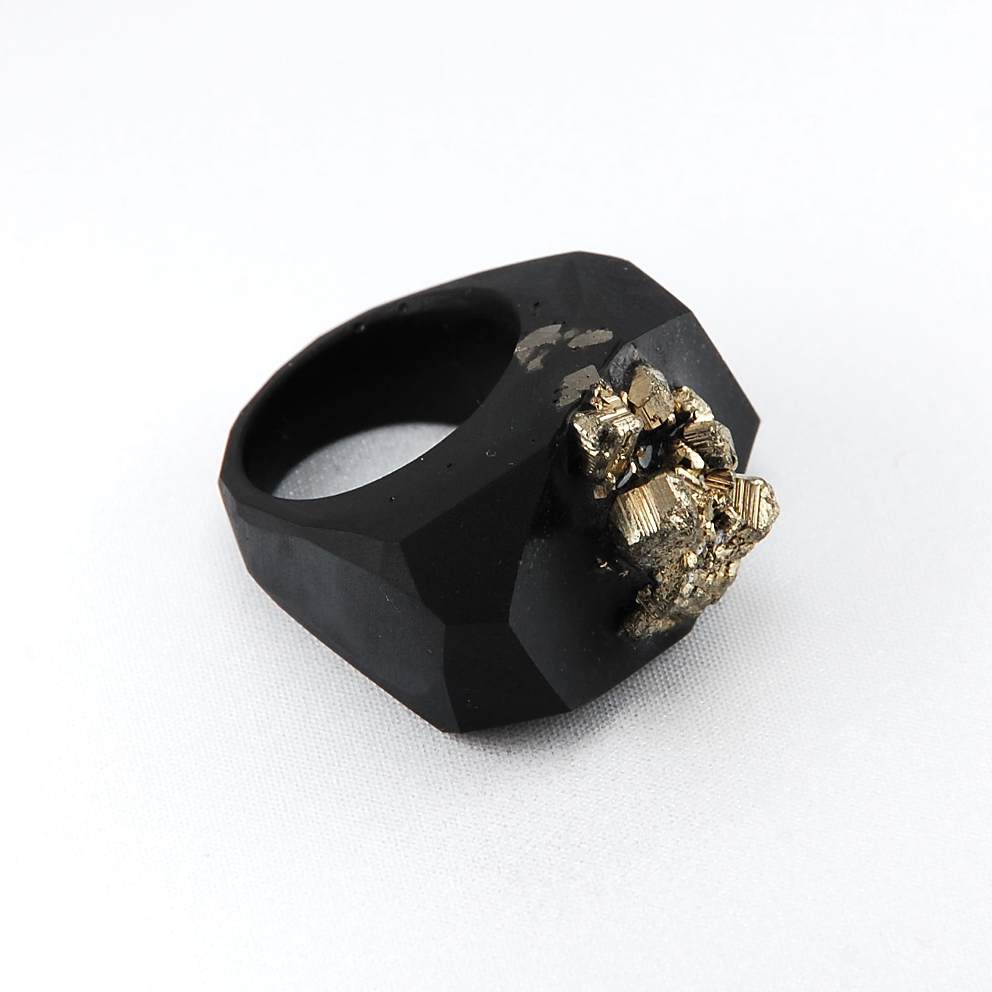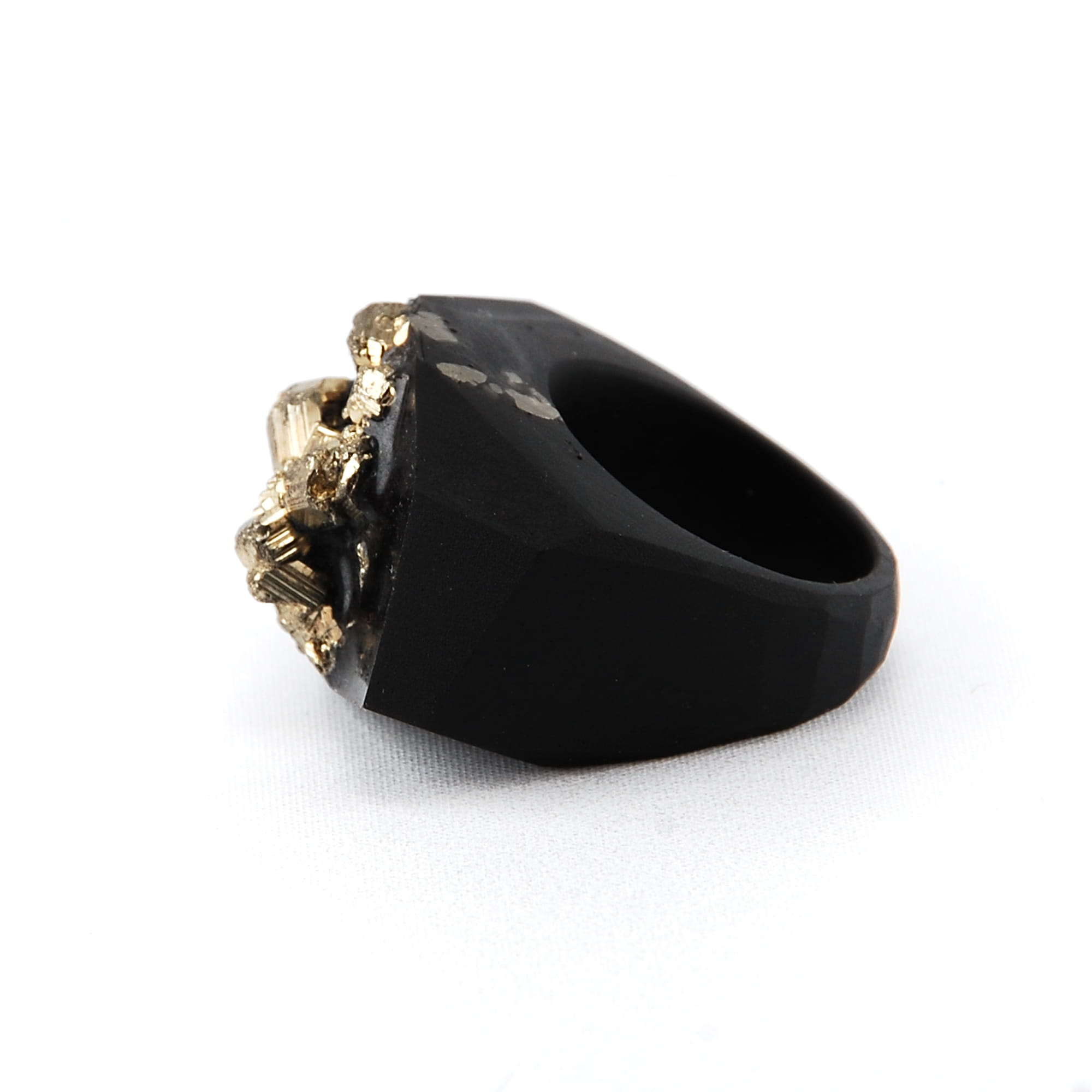 Unikatowy pierścień z surową bryłką pirytu oprawionym w czarnej żywicy jubilerskiej.