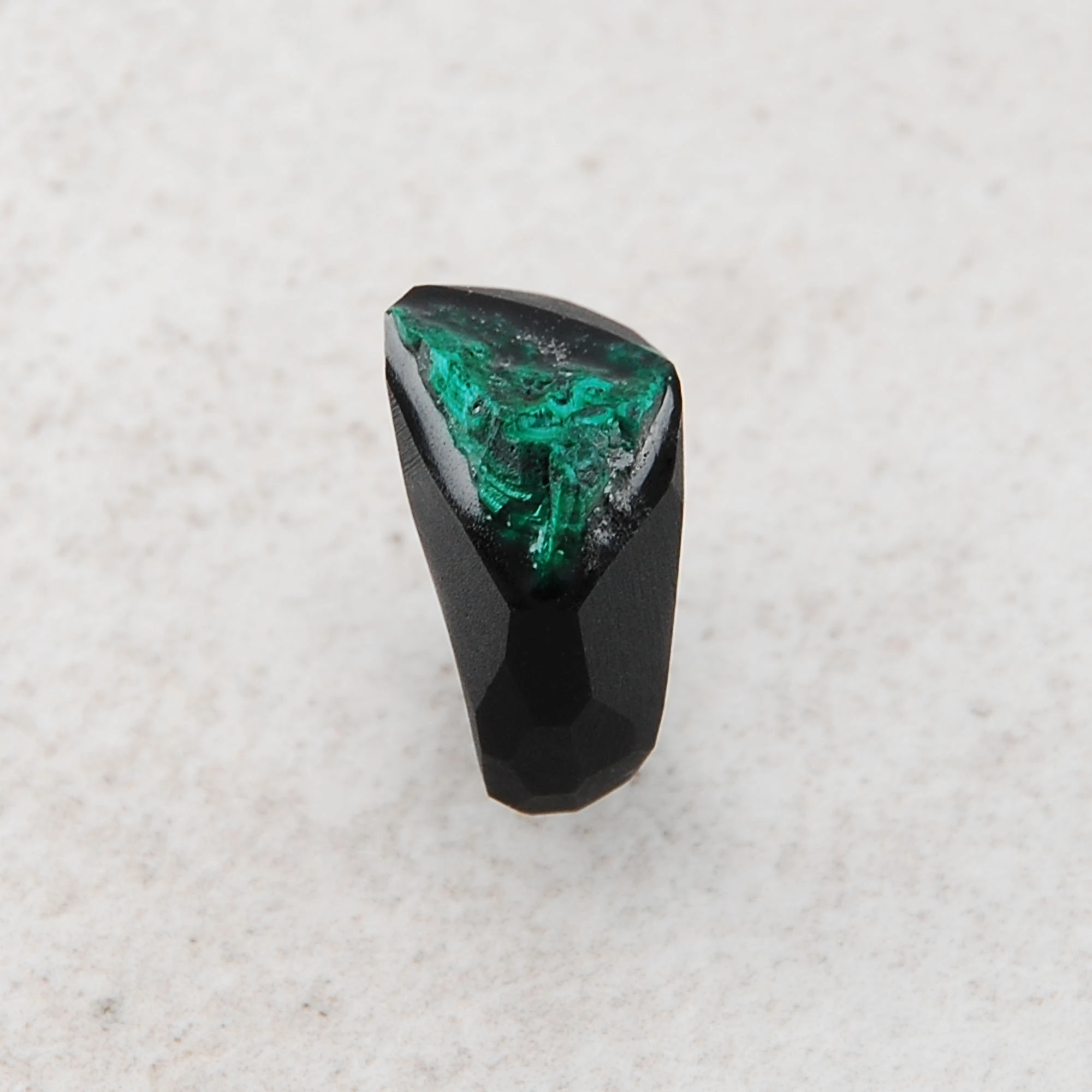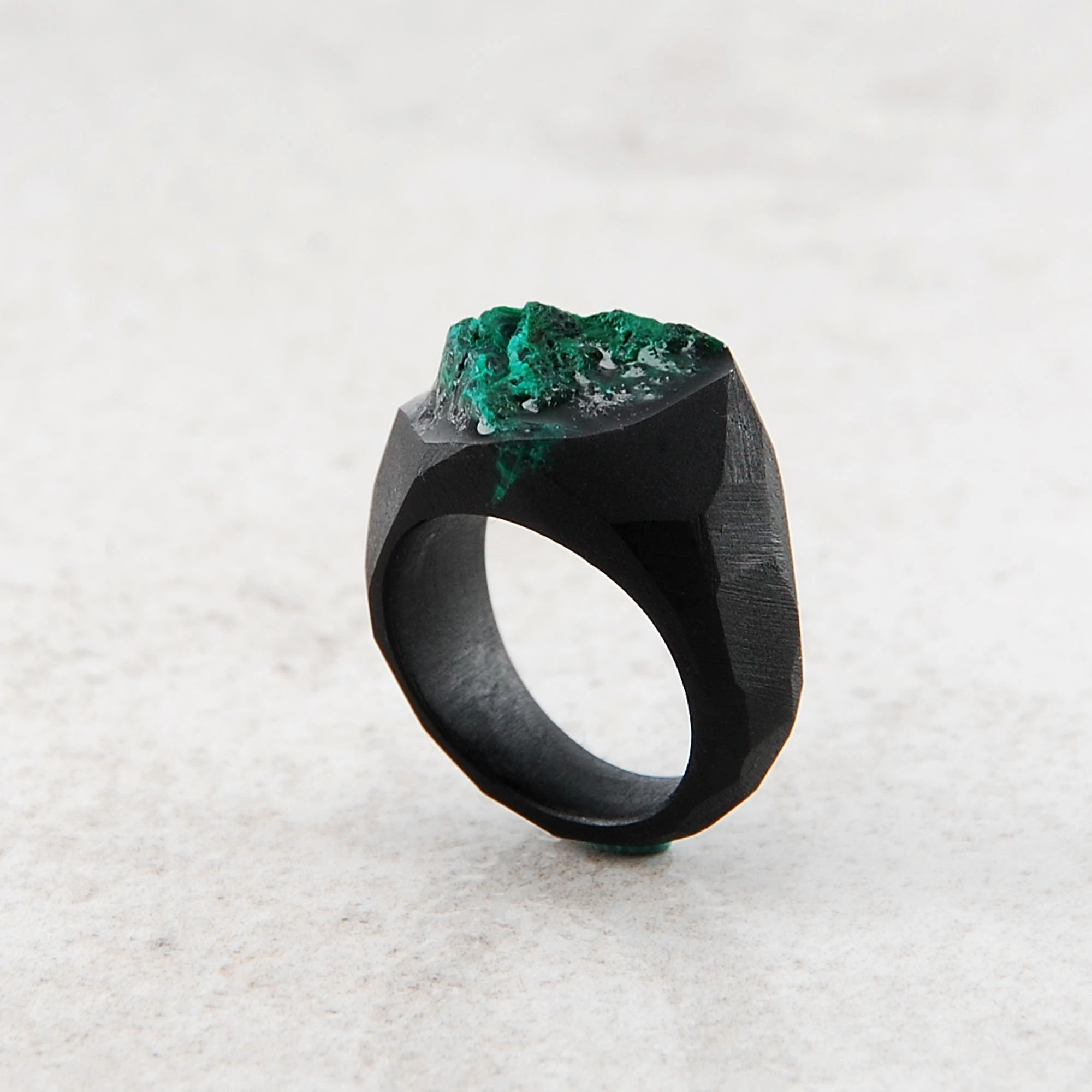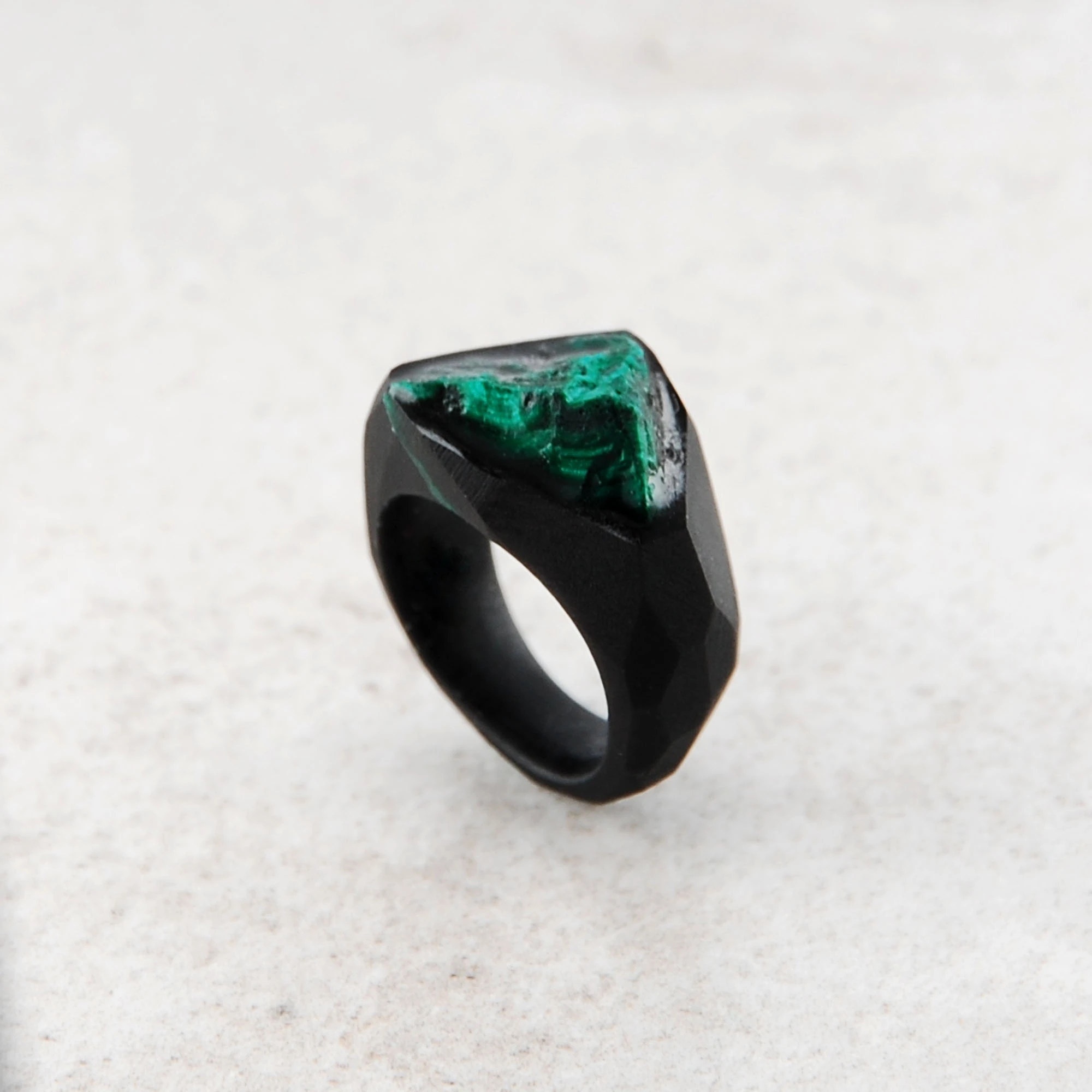 Unikatowy pierścionek z naturalnym malachitem oprawionym w czarnej matowej żywicy jubilerskiej. Wymiary kamienia 9x13mm, rozmiar 7,5