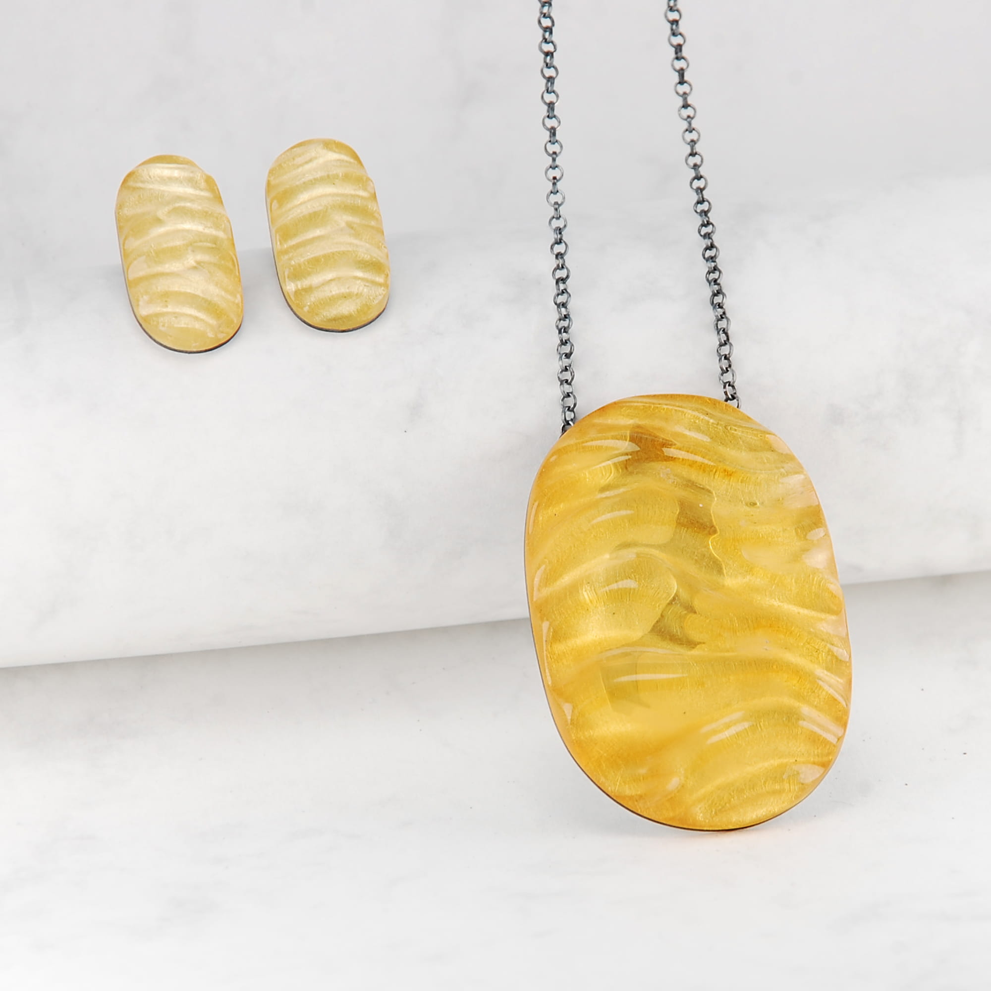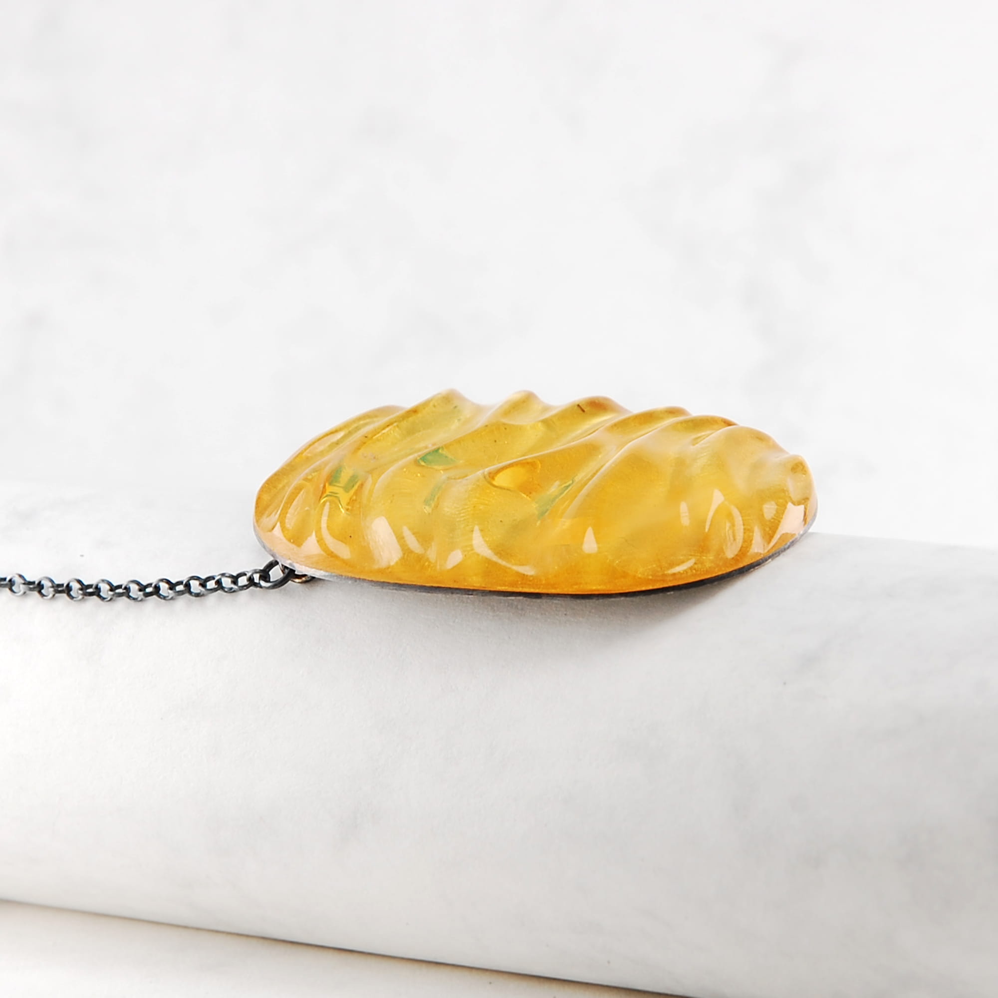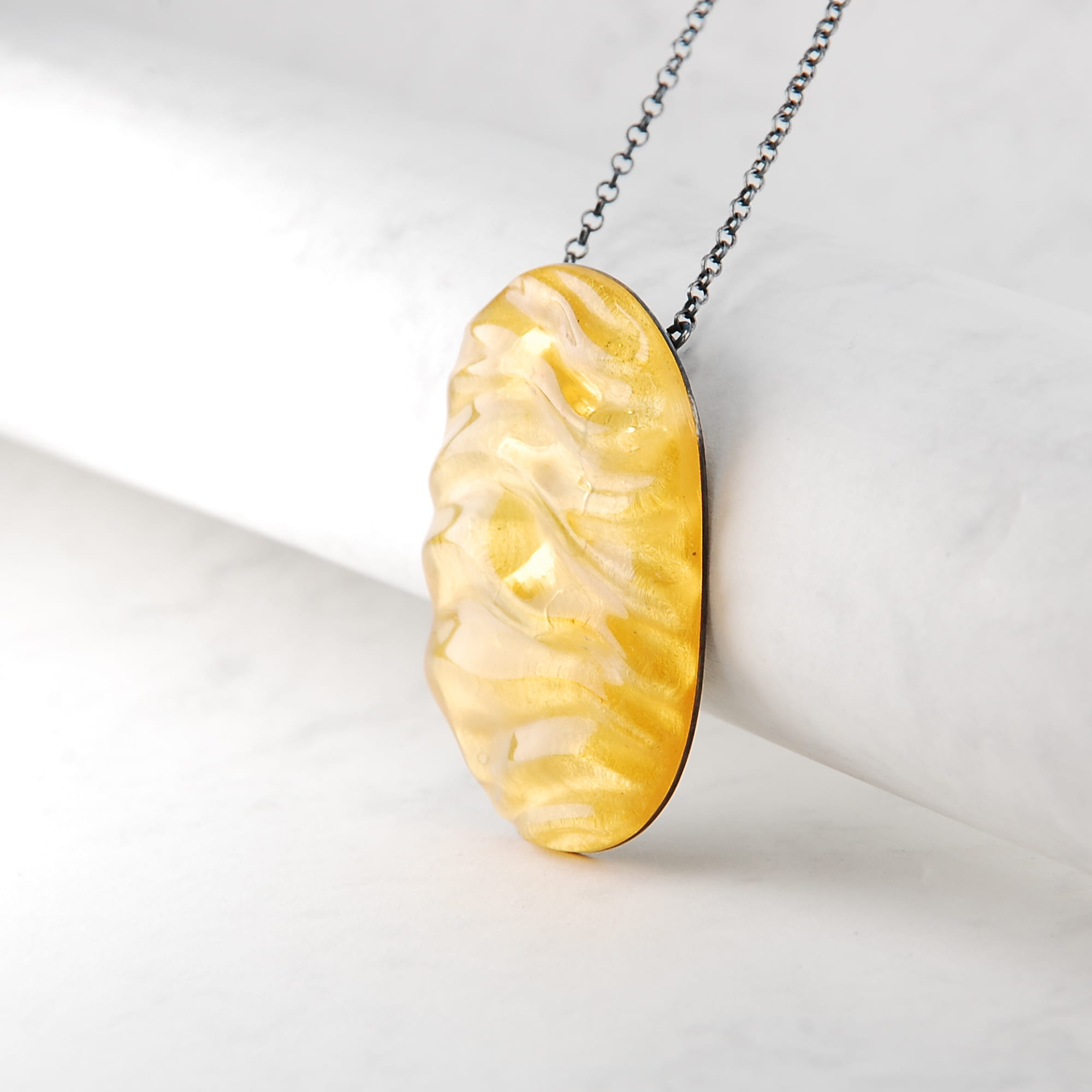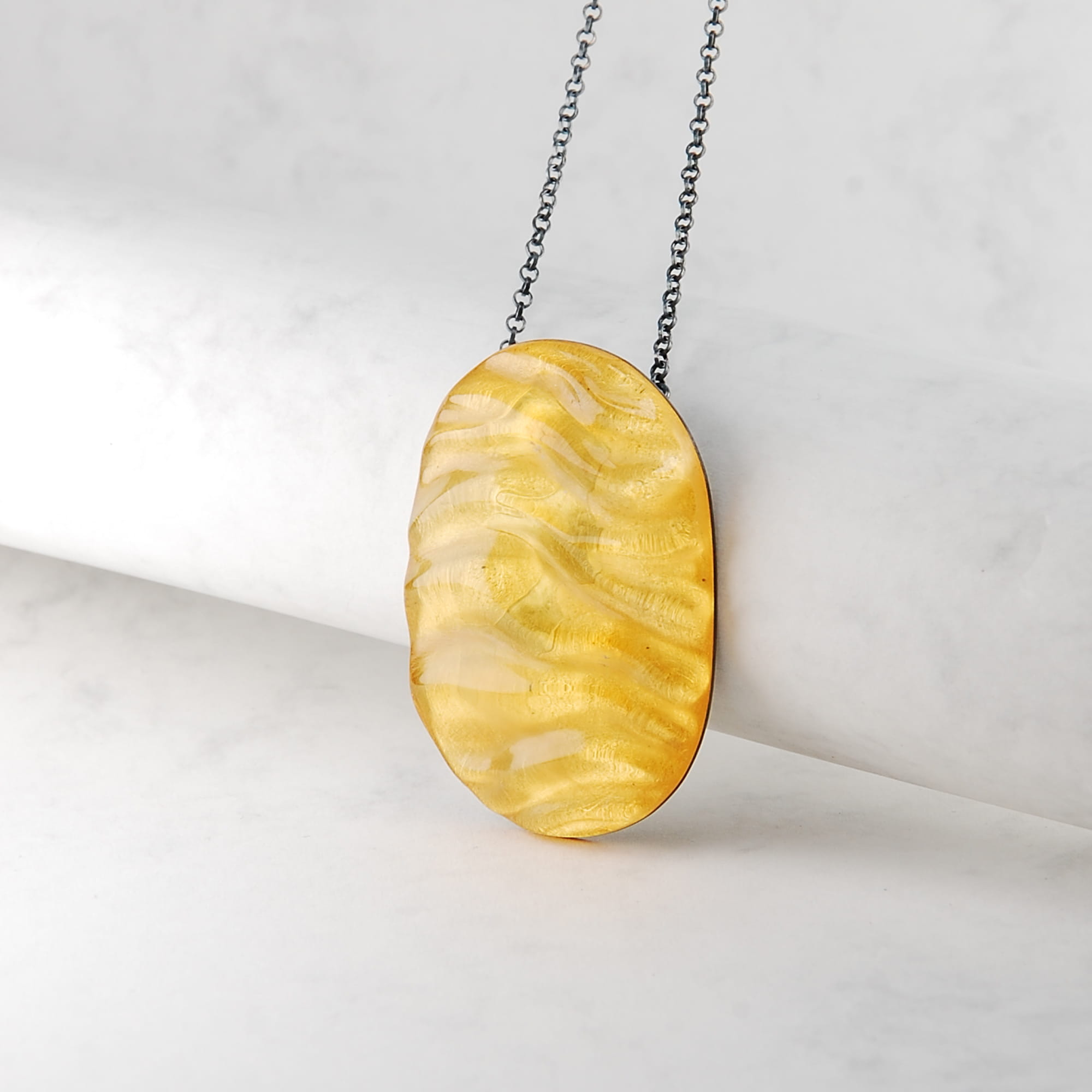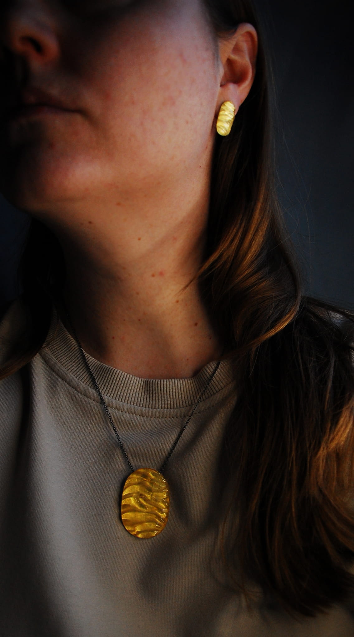 TAFLA to kolekcja, w której bursztyn jest na pierwszym planie: liczy się duża powierzchnia, refleksy i możliwość zajrzenia do wnętrza bryłki przez gładko wypolerowaną taflę. W wersjach z cytrynowym bursztynem światło dodatkowo podbija srebrna blaszka na spodzie, a naturalne odbicia kory tworzą na powierzchni kamienia niepowtarzalny rysunek. To propozycja dla osób, które chcą, by bursztyn „grał rolę główną” i był widoczny z daleka, ale wciąż w nowoczesnym, minimalistycznym ujęciu.
