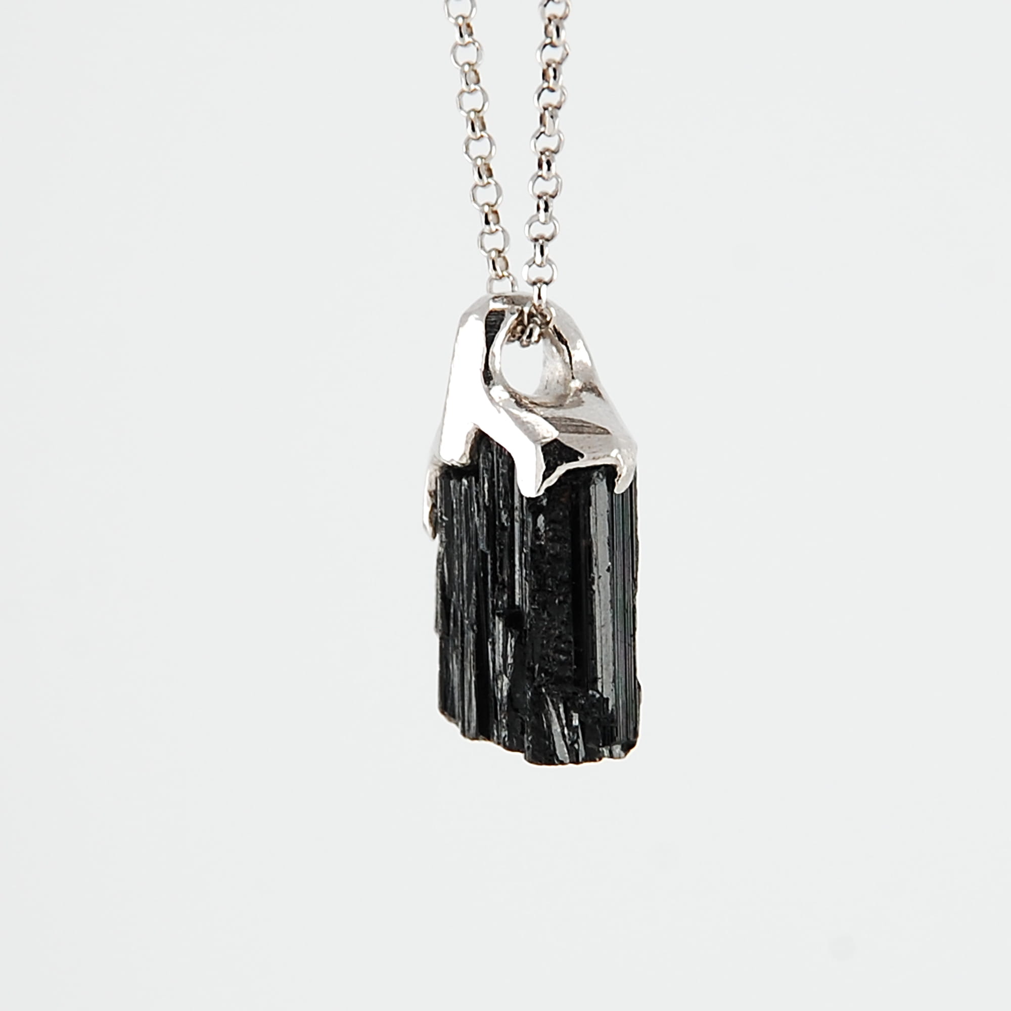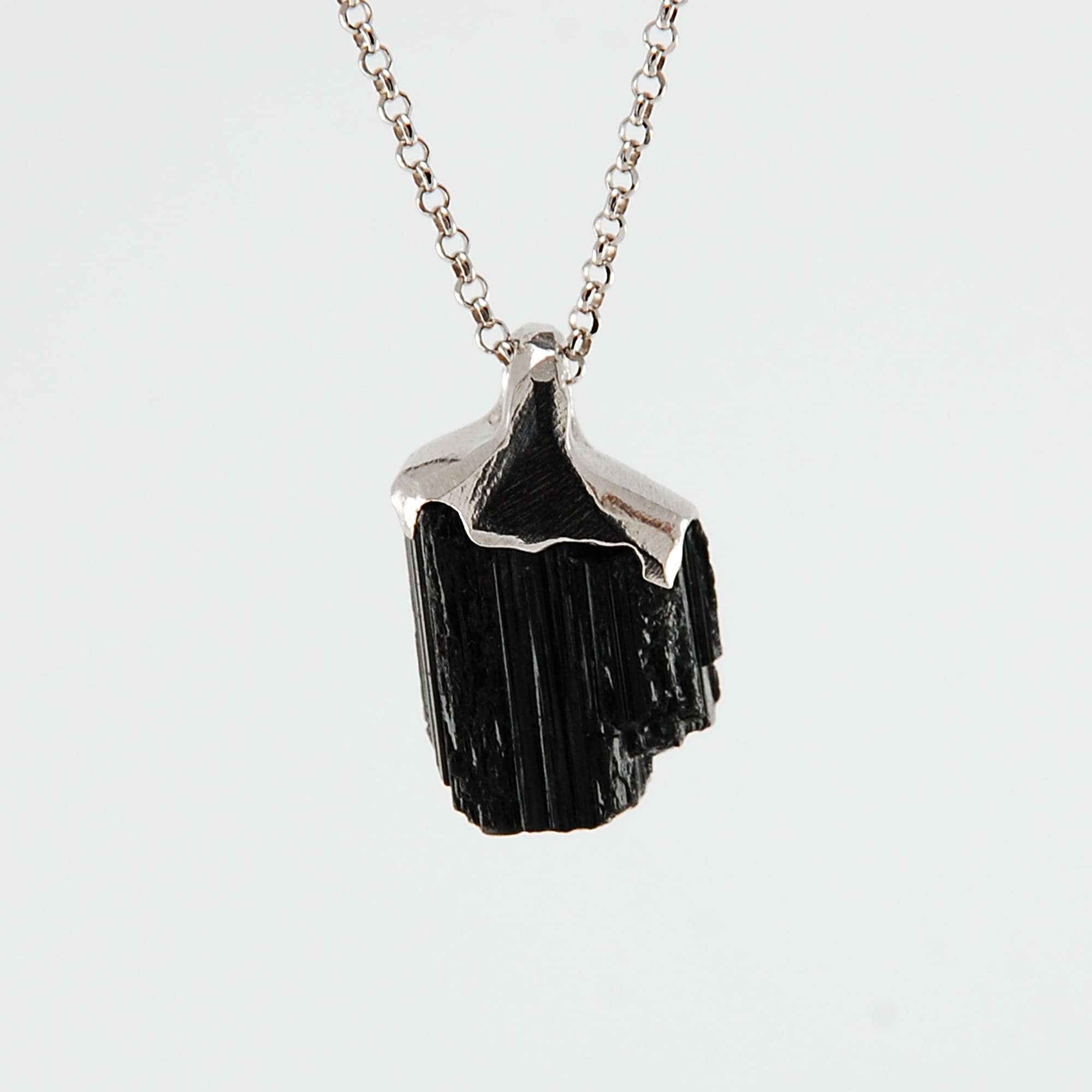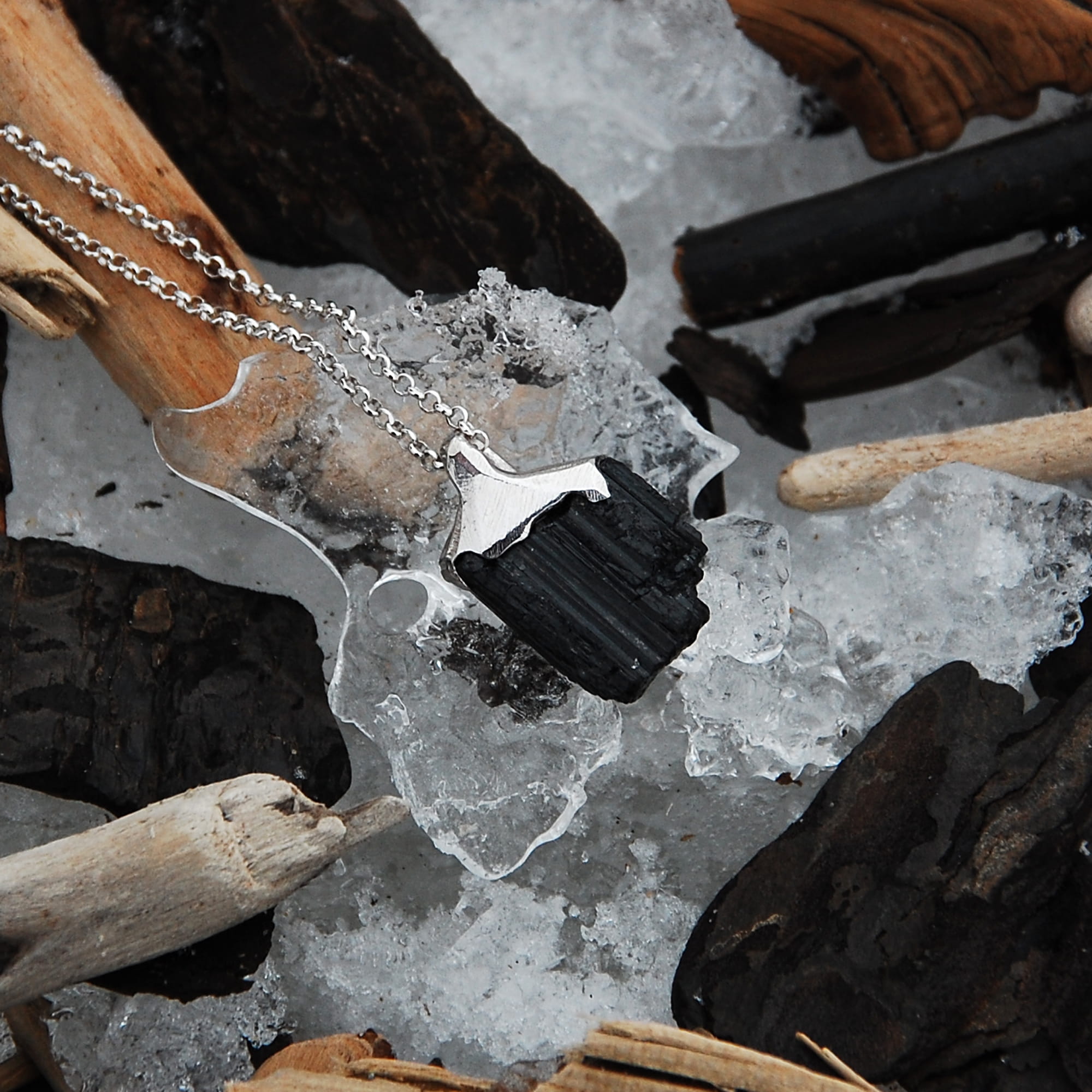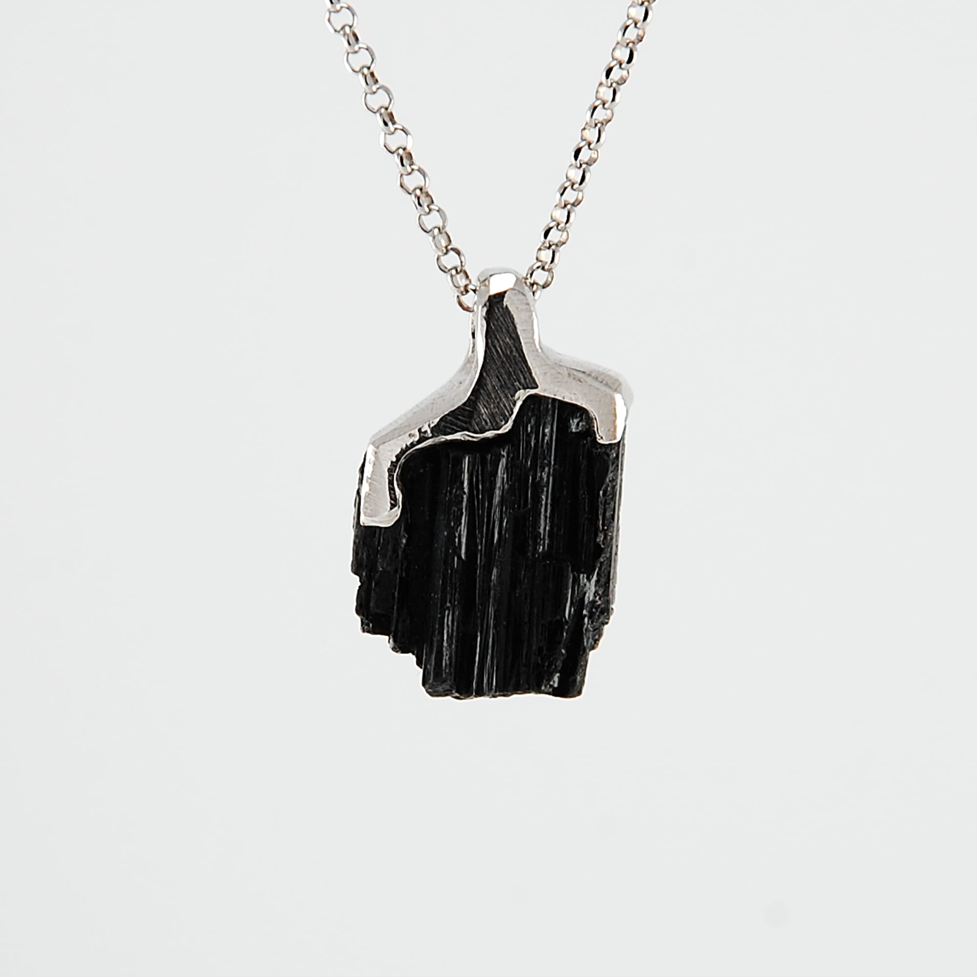 Unikatowy naszyjnik z kamieniem naturalnym czarnym turmalinem oprawionym w srebro próby 925 pokrytego szlachetnym rodem, dzięki czemu srebro nie ciemnieje.