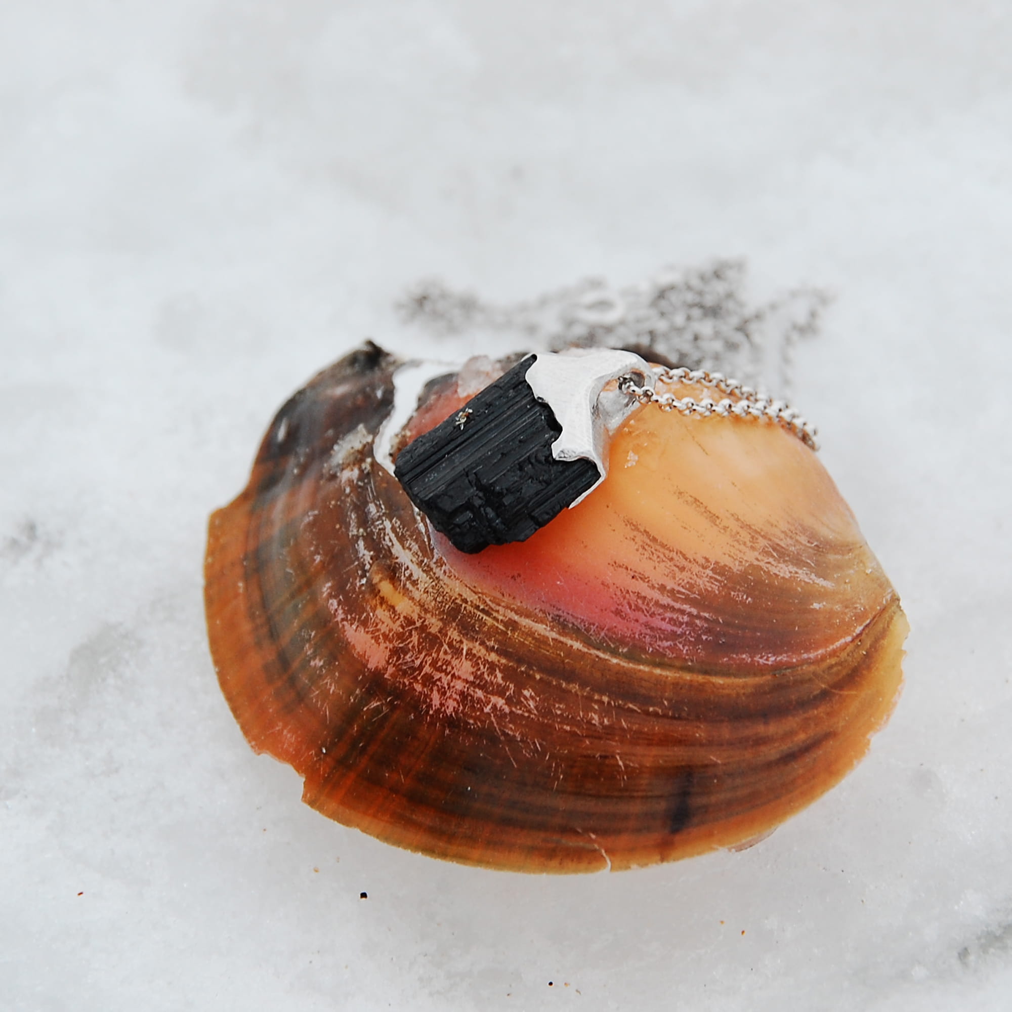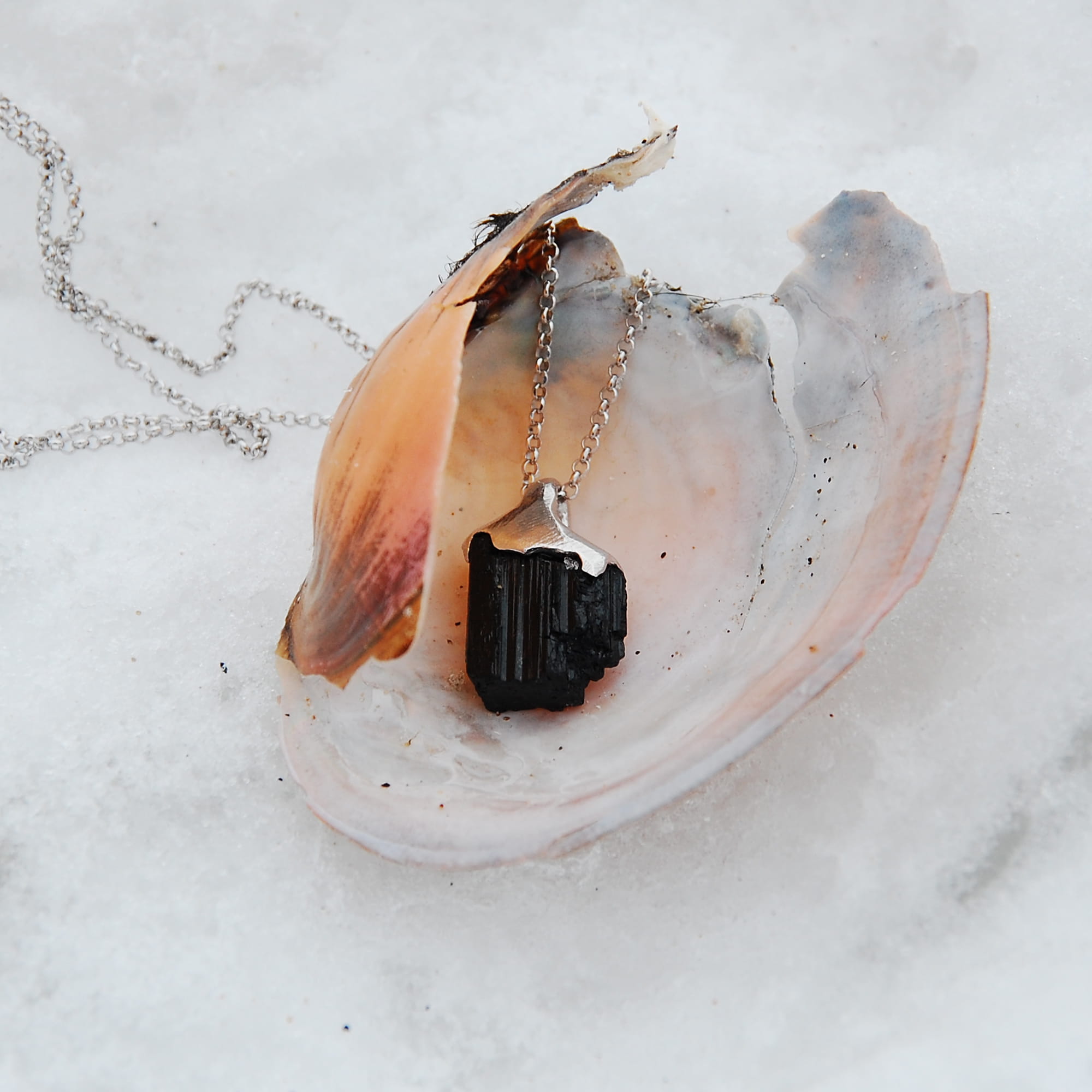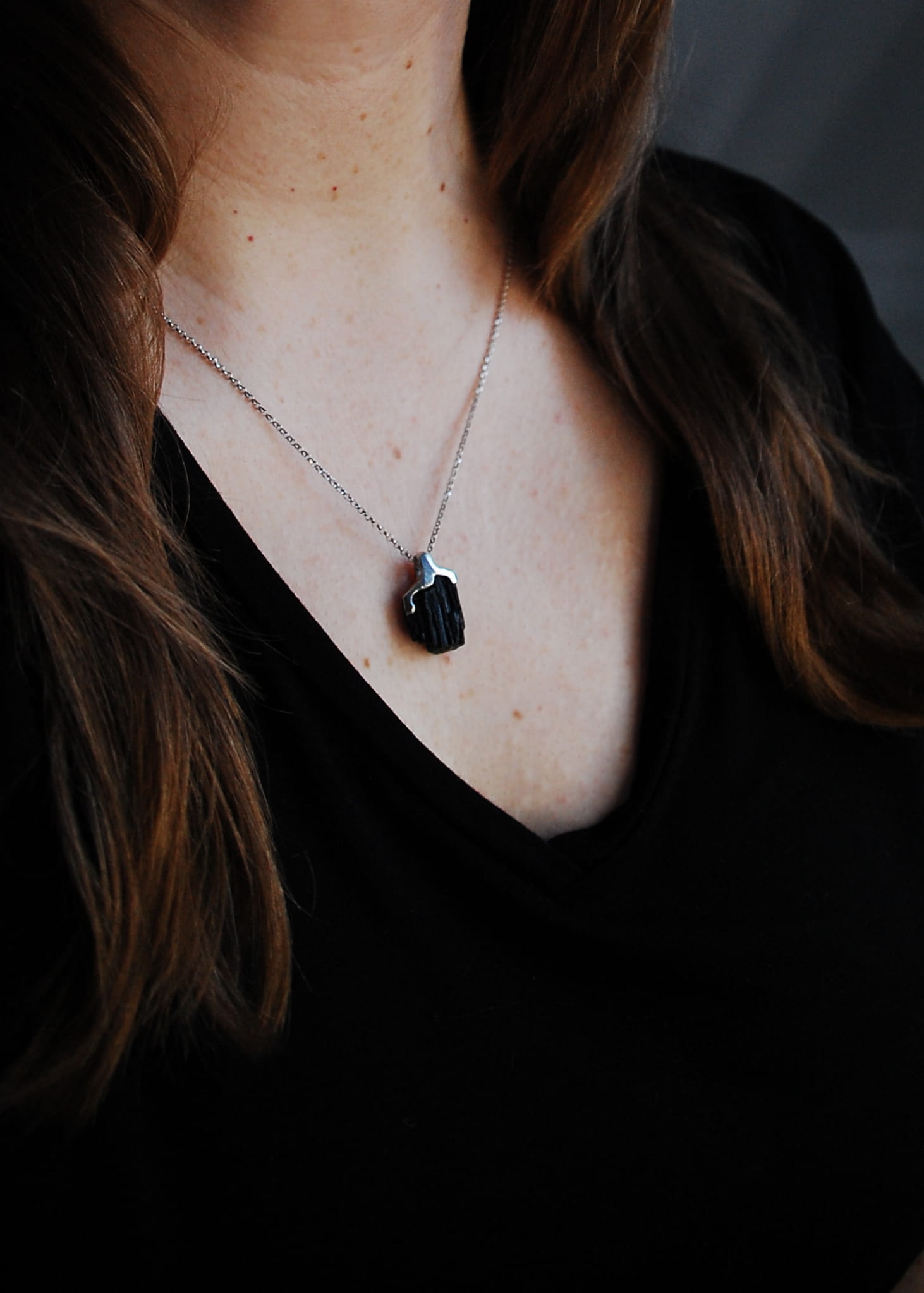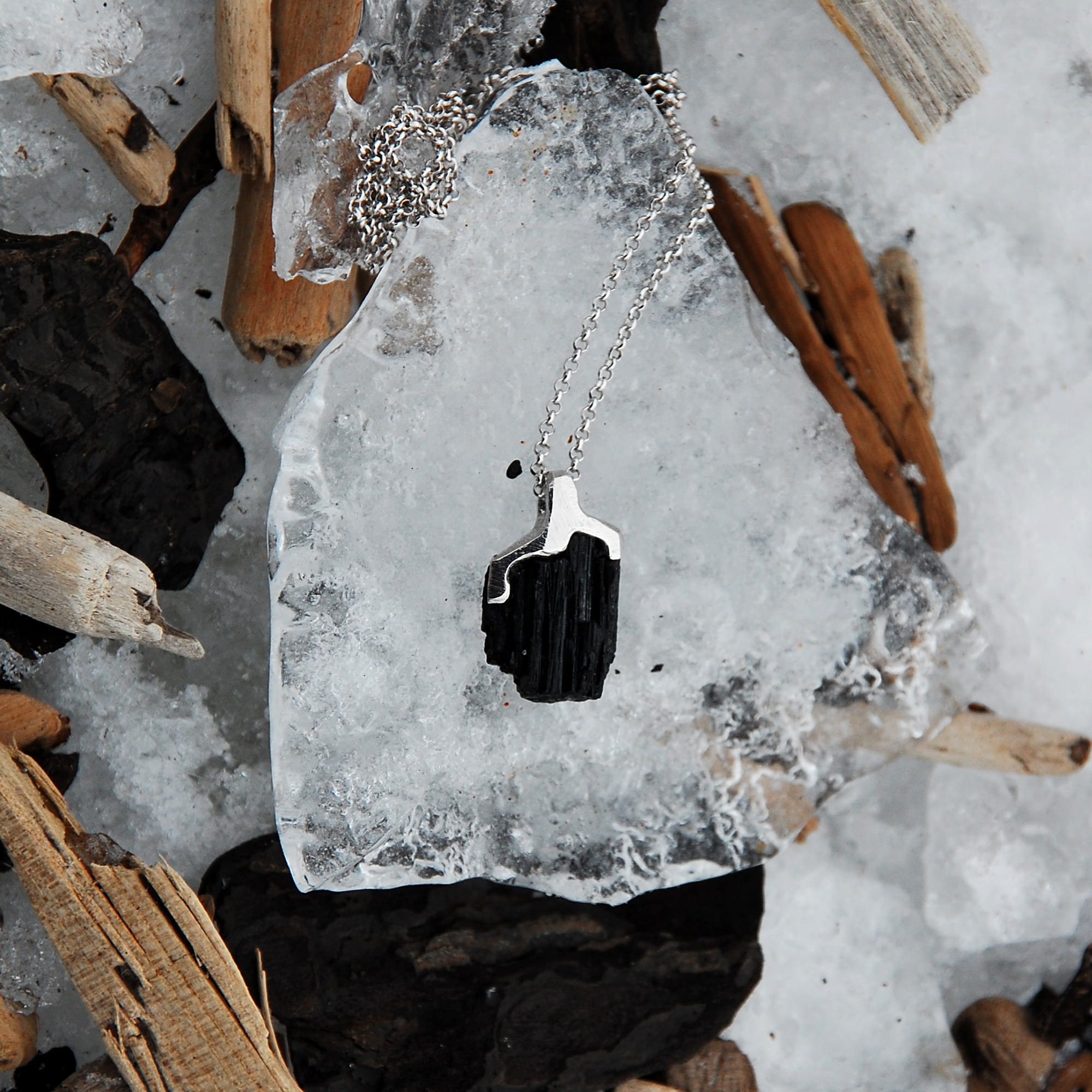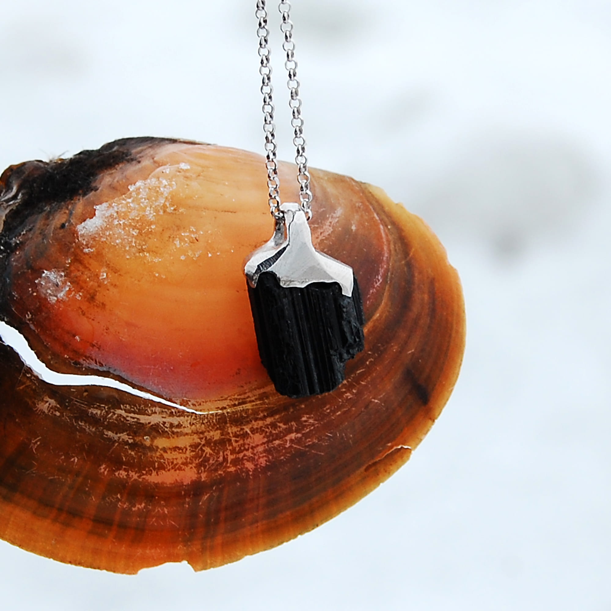 Unikatowy naszyjnik z kamieniem naturalnym czarnym turmalinem oprawionym w srebro próby 925 pokrytego szlachetnym rodem, dzięki czemu srebro nie ciemnieje.
